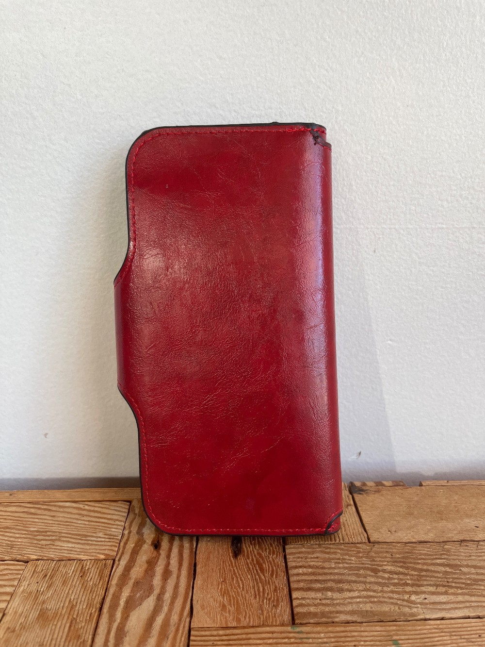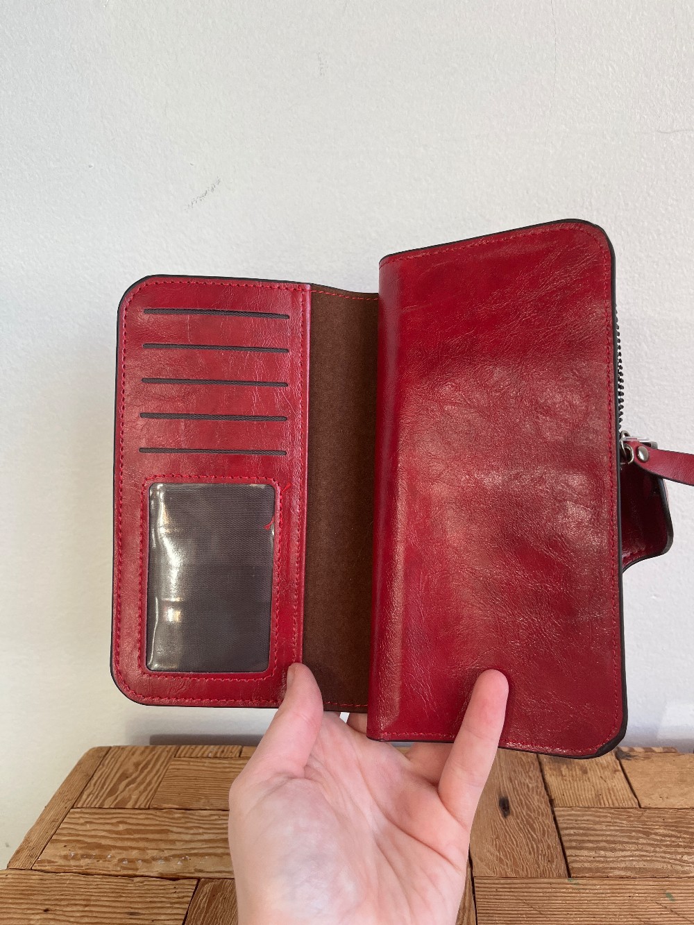 Clip closure with 16 card slots, two ID screens, a change pocket, and a cash slip. Fixed with a glossy red outer and lined with a black inner.