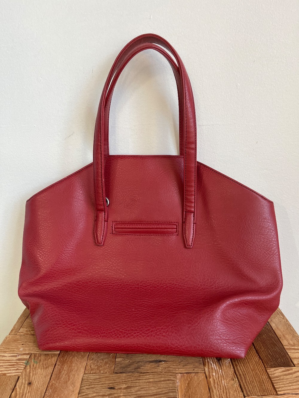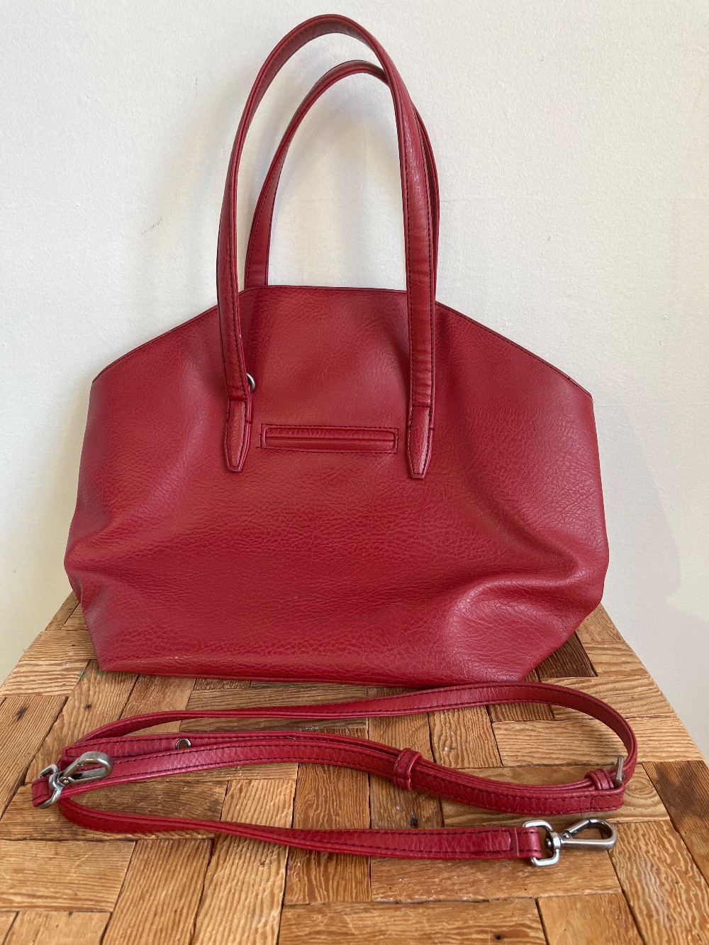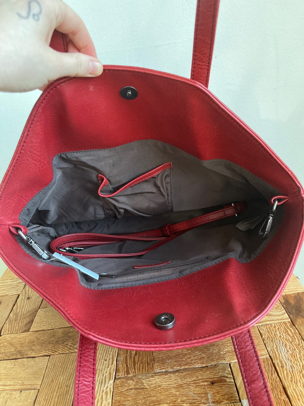 “Tote that can be worn crossbody with removable and adjustable strap. Secured magnetic snap closure and back slit pocket. Interior: zipper pocket, smartphone pocket, logo-embossed Dwell tag. 100% recycled nylon lining.”