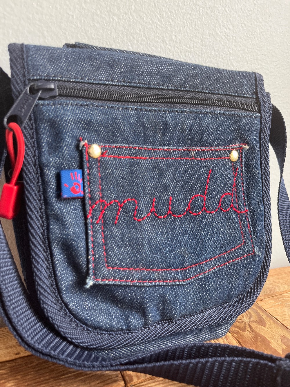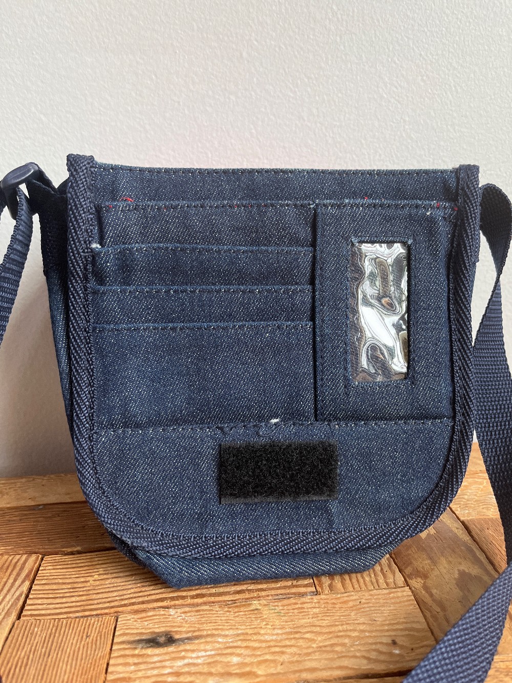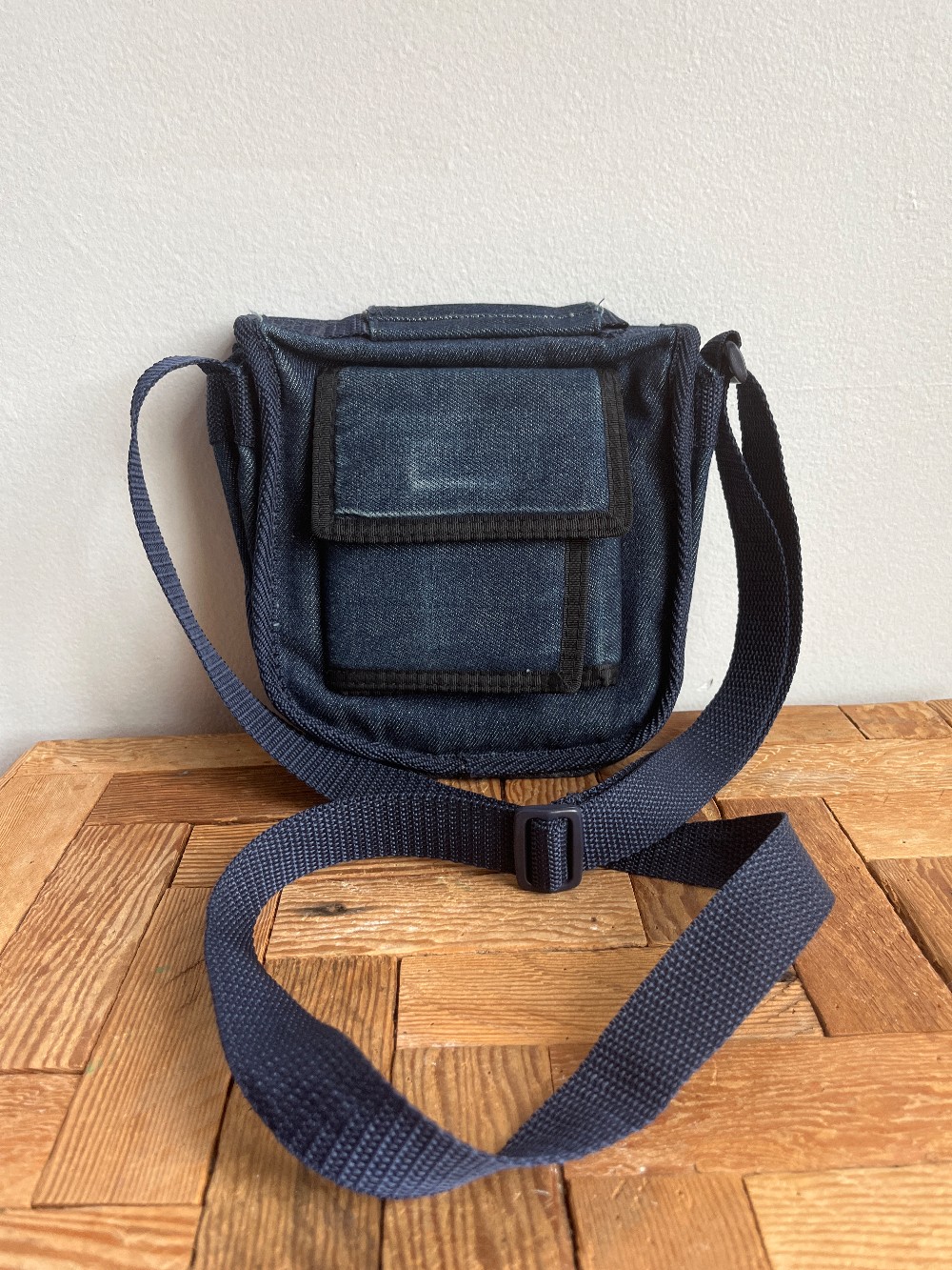 Denim crossbody bag from the early 2000’s. Features an adjustable crossbody strap and multiple zip closures with velcro.