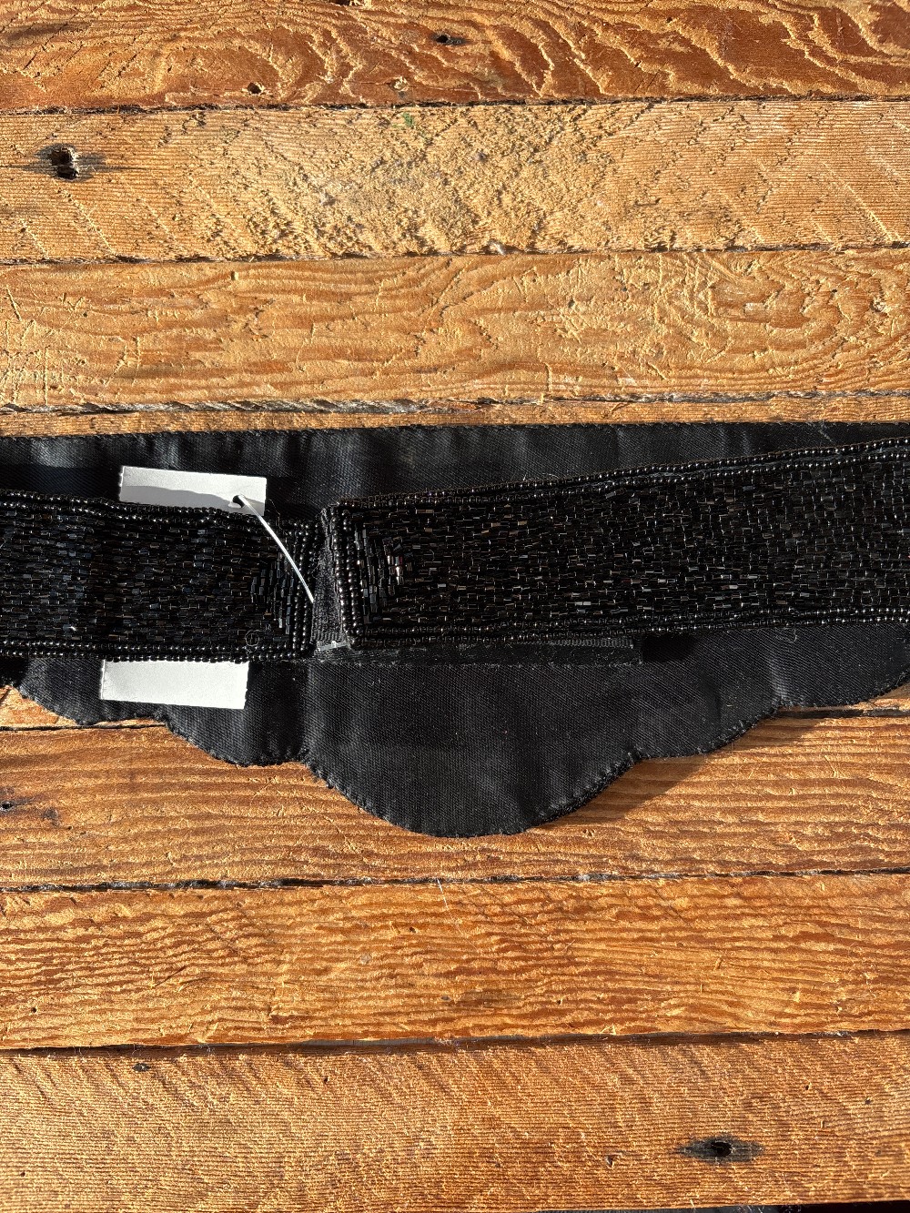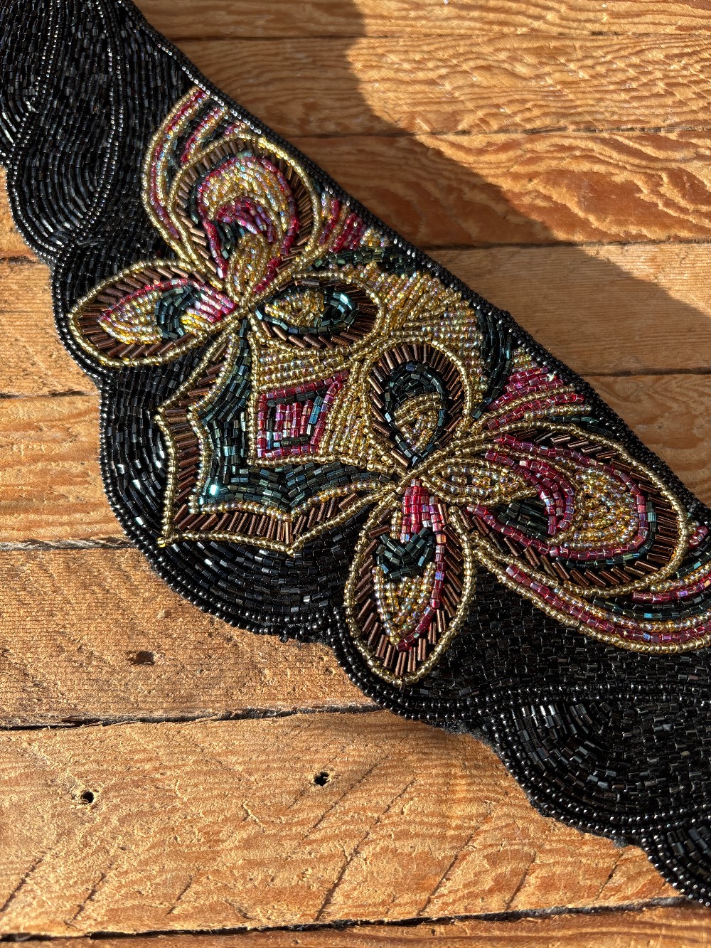 Would fit medium waist, best to try on. Matching clutch in store! A funky vintage waist belt with a back velcro closure, inner satin lining and multicoloured intricate beaded print.