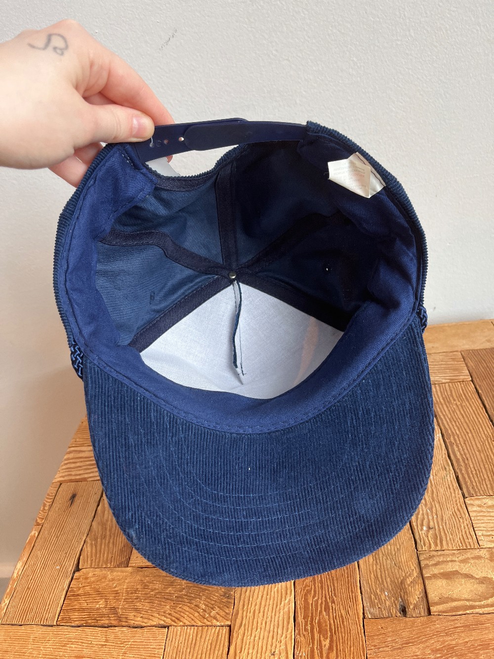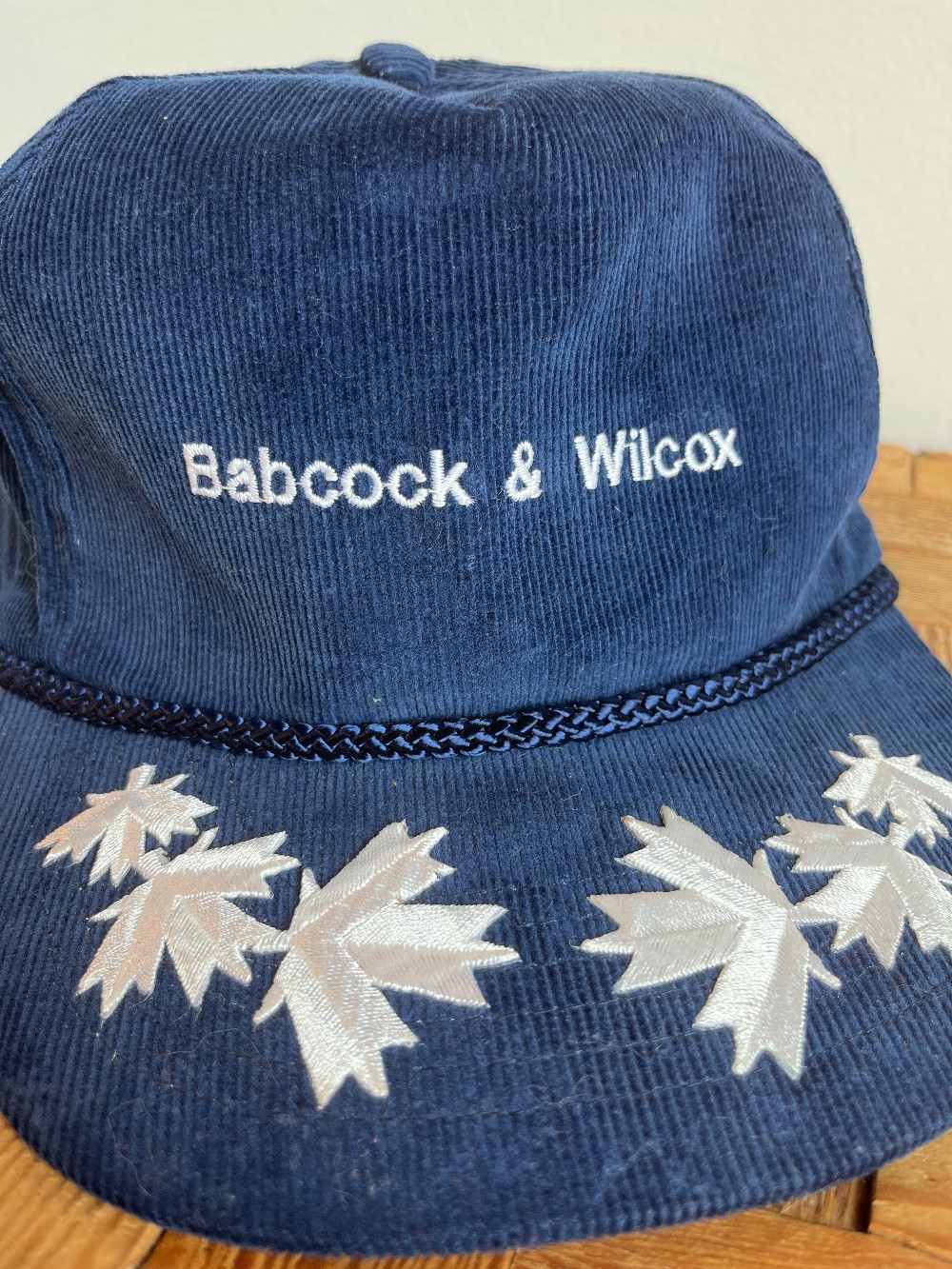A vintage corduroy cap with Babcock & Wilcox logo on front with embroidered leaves on brim. Snap back, tie detail brim