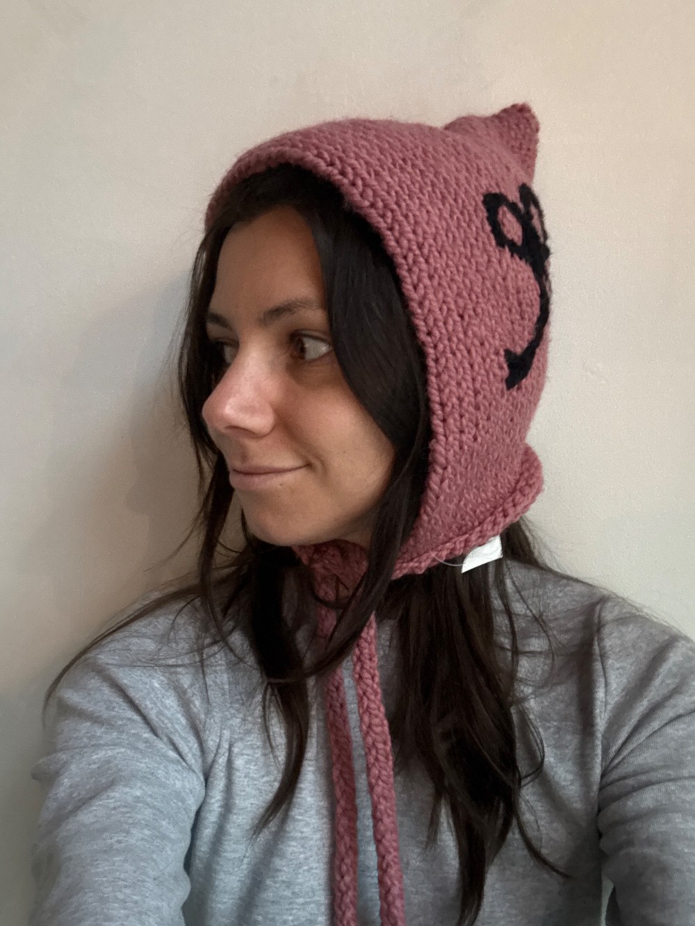 An adorable pink hood with a black bow along the left side. Ties up under the chin and has a small point in the back.