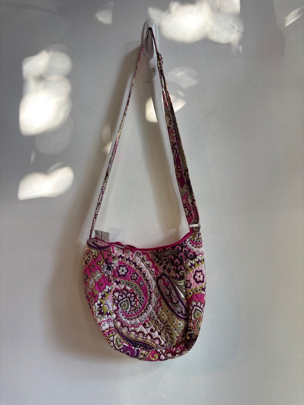 Adjustable strap, silver hardwear, quilted fabric, zip top