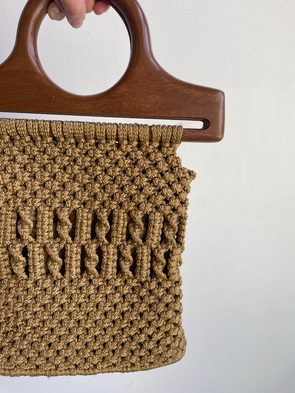 Stunning crochet handbag with a floral fabric inner lining and wooden round handle.