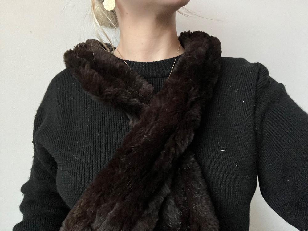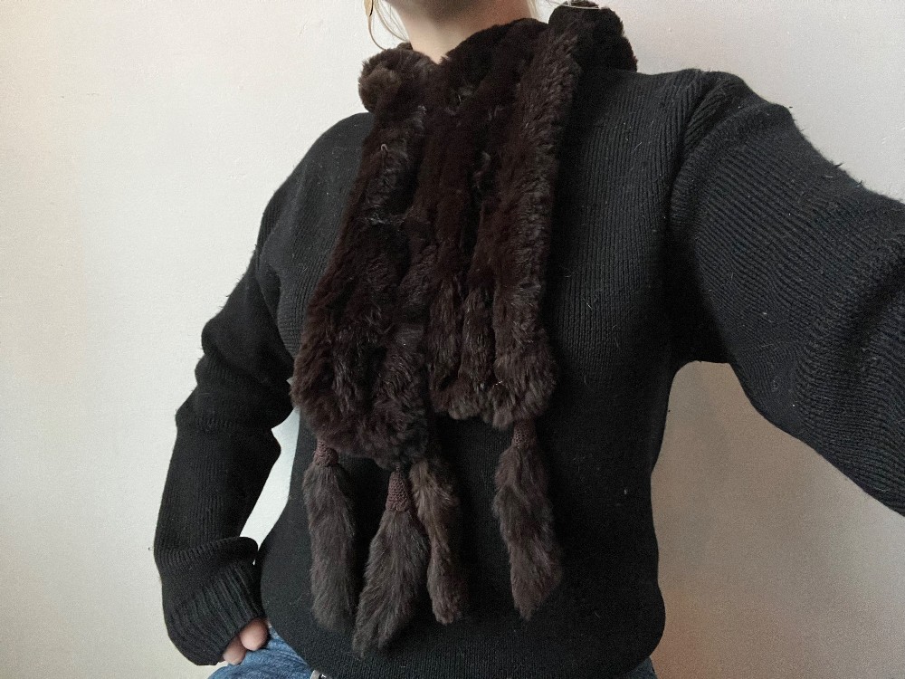 Features rabbit feet hanging from the ends. Soft brown rabbit fur with a four tiered band system that is sewn together with clips.