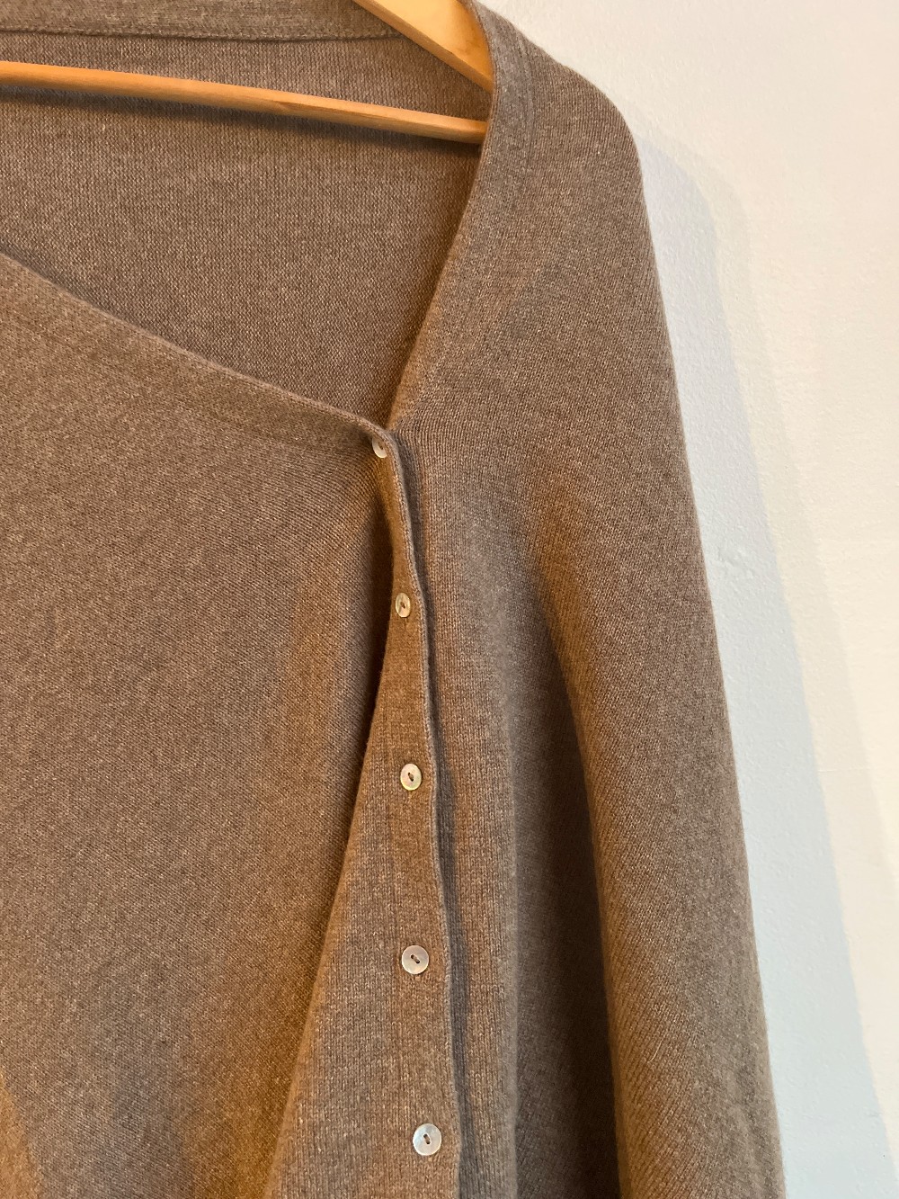“Luxurious cashmere shawl that can be worn as a scarf, wrap, poncho – thanks to the clever mother of pearl button design – in fact many ways click on how to wear below.”