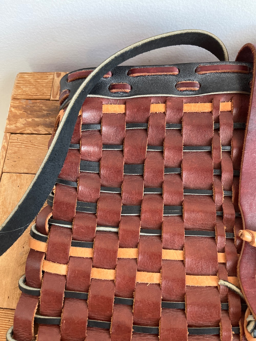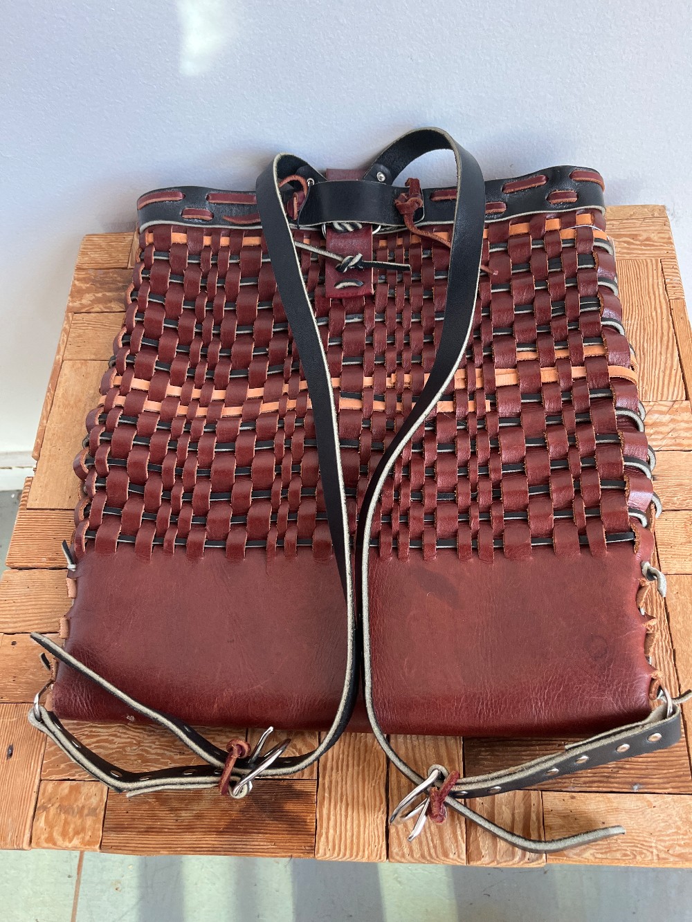 Stunningly crafted woven leather backpack with adjuastable shoulder straps and a single strap closure.