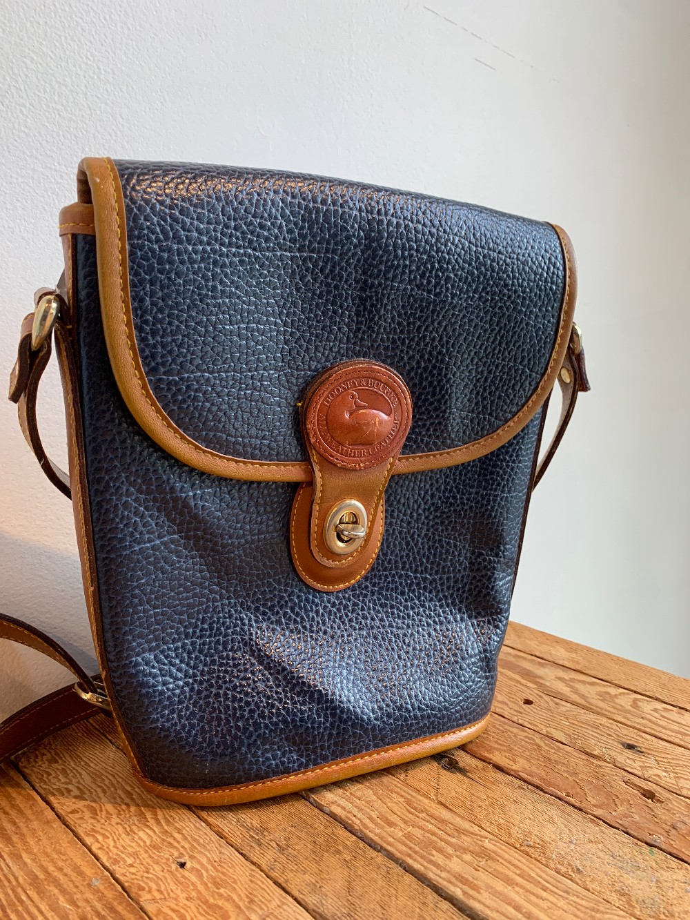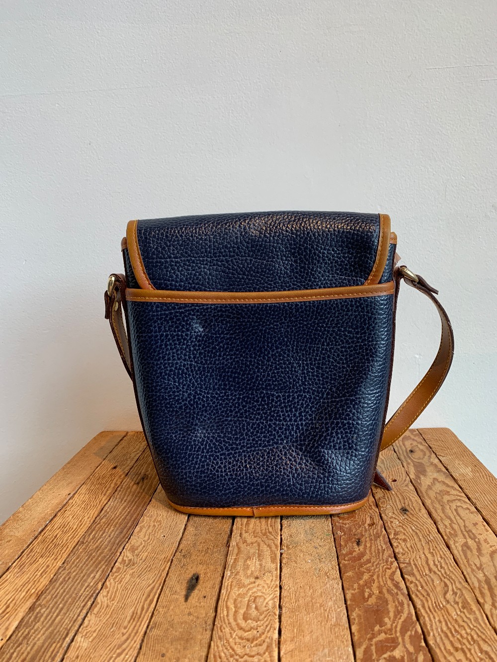 As is: some wear on trim. Pebbled leather bucket styled back with a flap and twist clasp closure, classic logo patch on front. Inner is suede