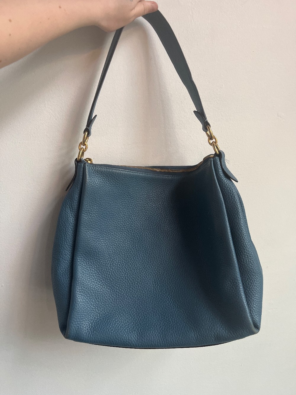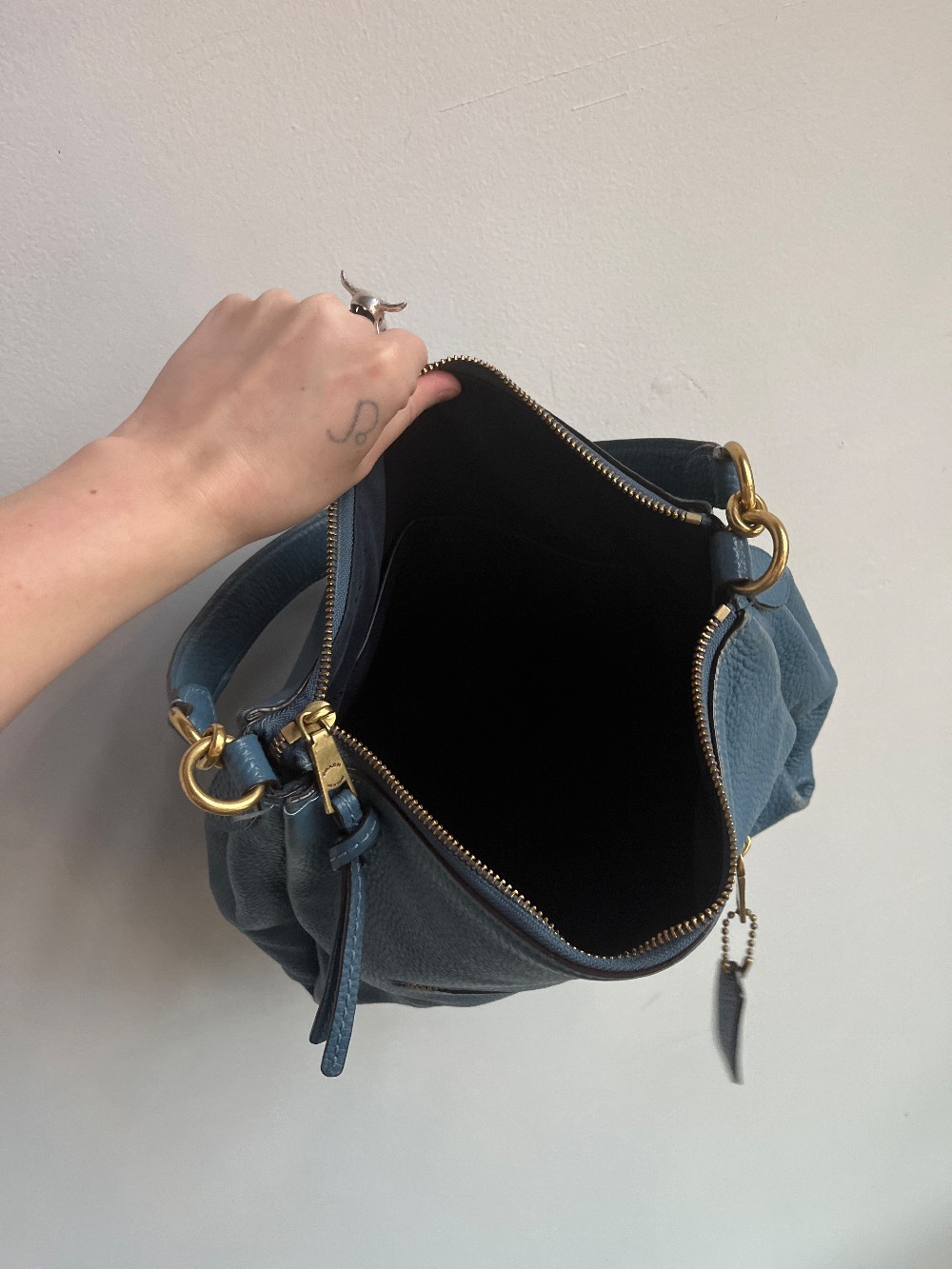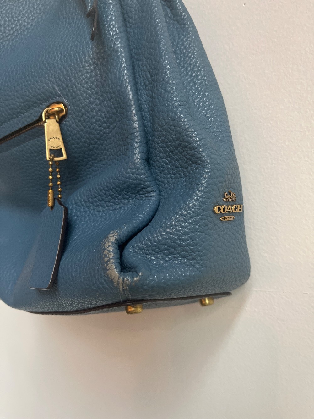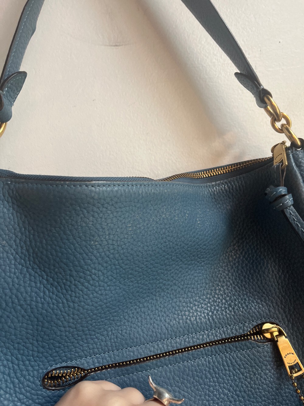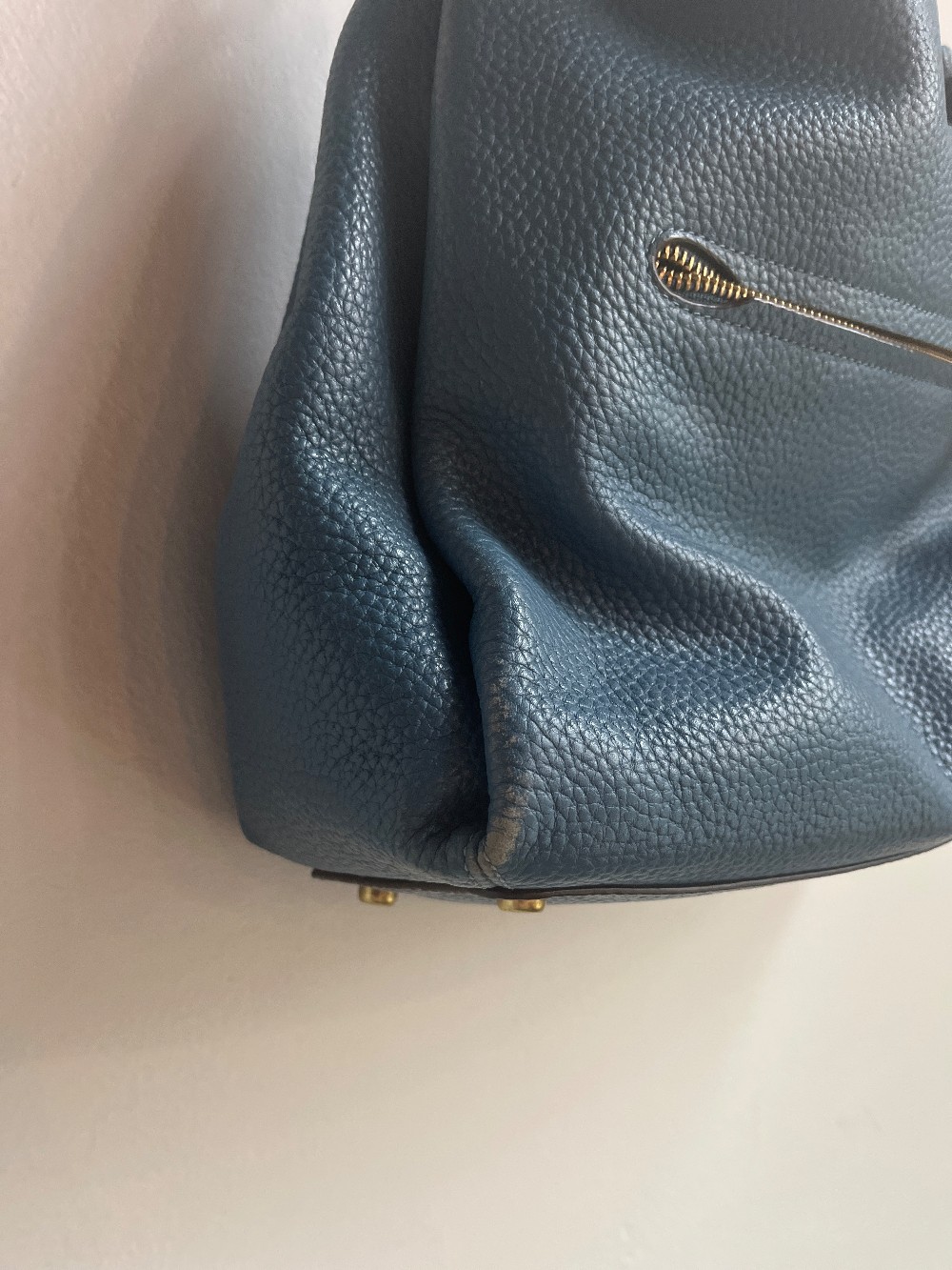 As is: Stitching at one side of zipper slightly coming undone, Some wear on the leather at the corners. Designer bag at a great price. Authentication not included but believed to be real. It has gold hardware, zippered pockets and a leather shoulder strap. The leather is a textured blue.