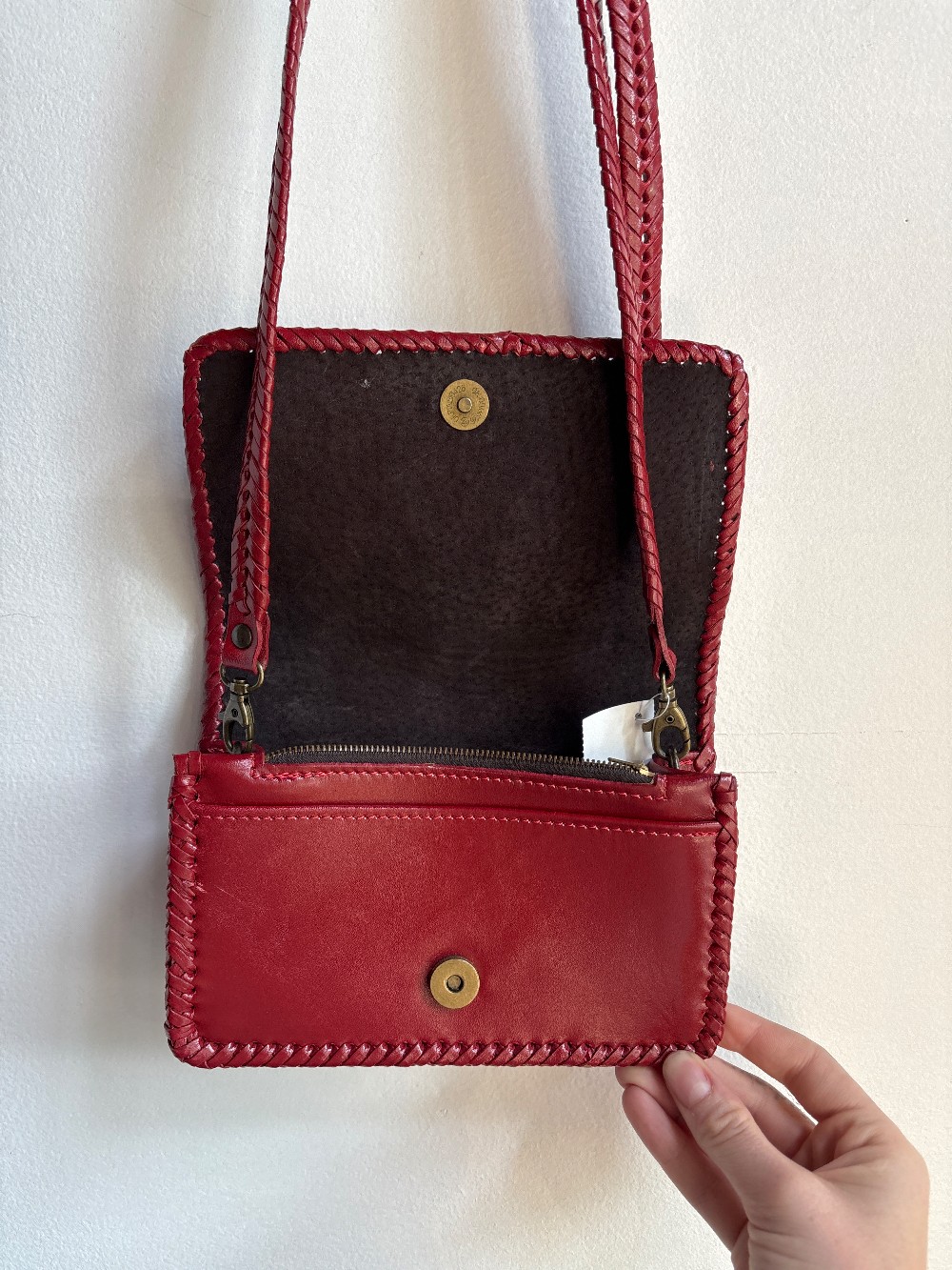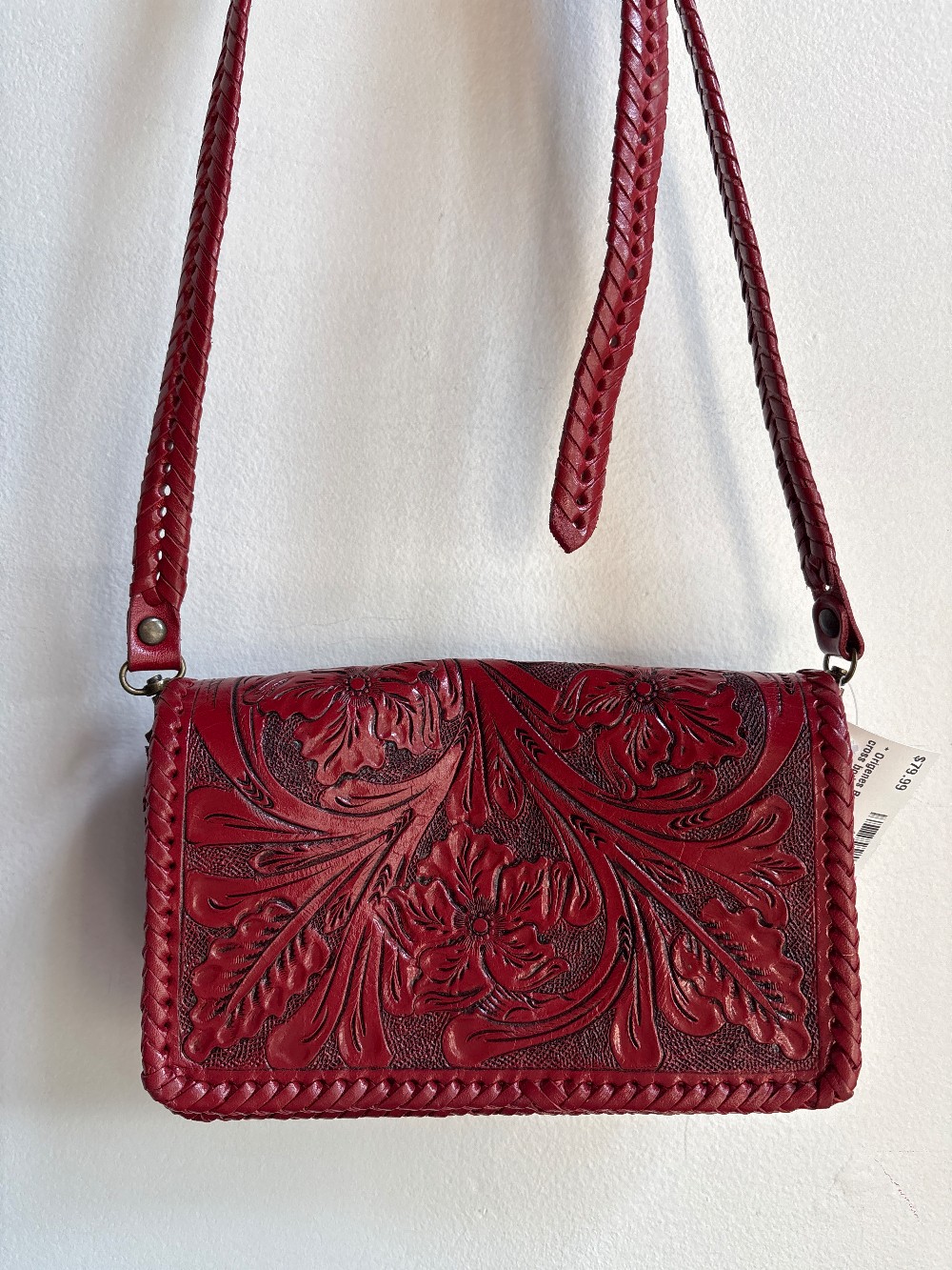 This handbag is detailed with hand carving on the front flap and a sleek leather body, adjustable shoulder strap, full suede lining, hand wrapped leather edging and has magnetic snap closures.