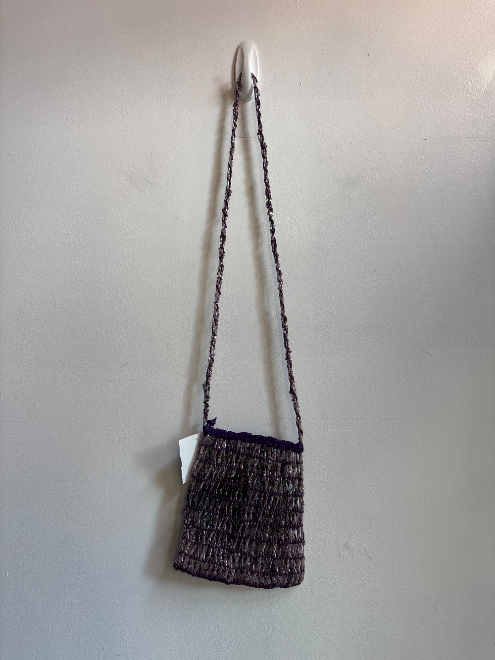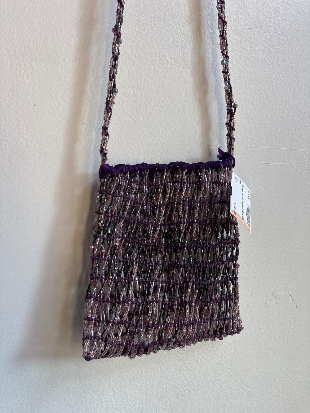 A basket woven, purple iridescent beaded bag with a rich purple satin trim. Features purple threading and a shoulder strap.