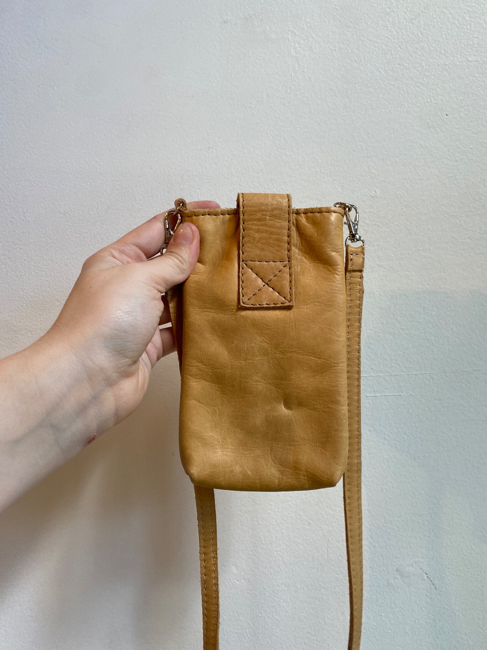 An artisan handmade leather pouch with a removable shoulder strap. Features a clip front and two slip in pockets with patterned lining.