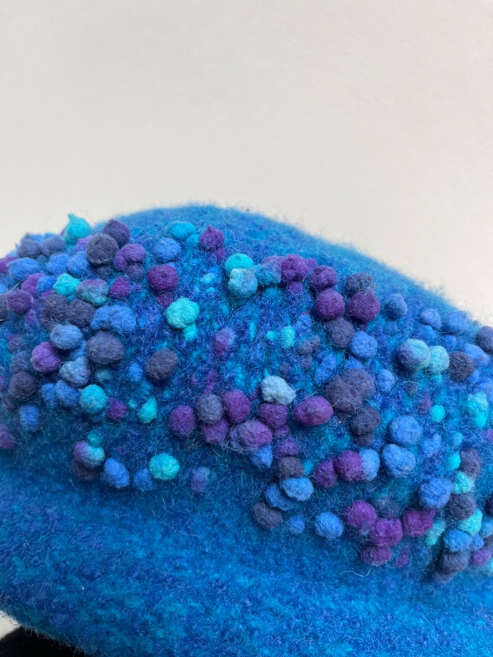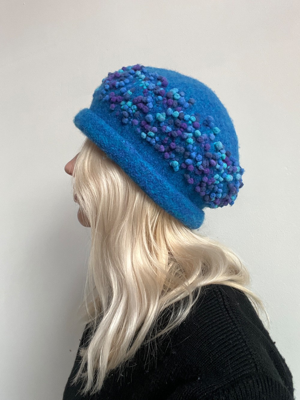 Would fit a small head best. A cute hat that is made from felted wool, has a round top and mini multicolour pom pom trim