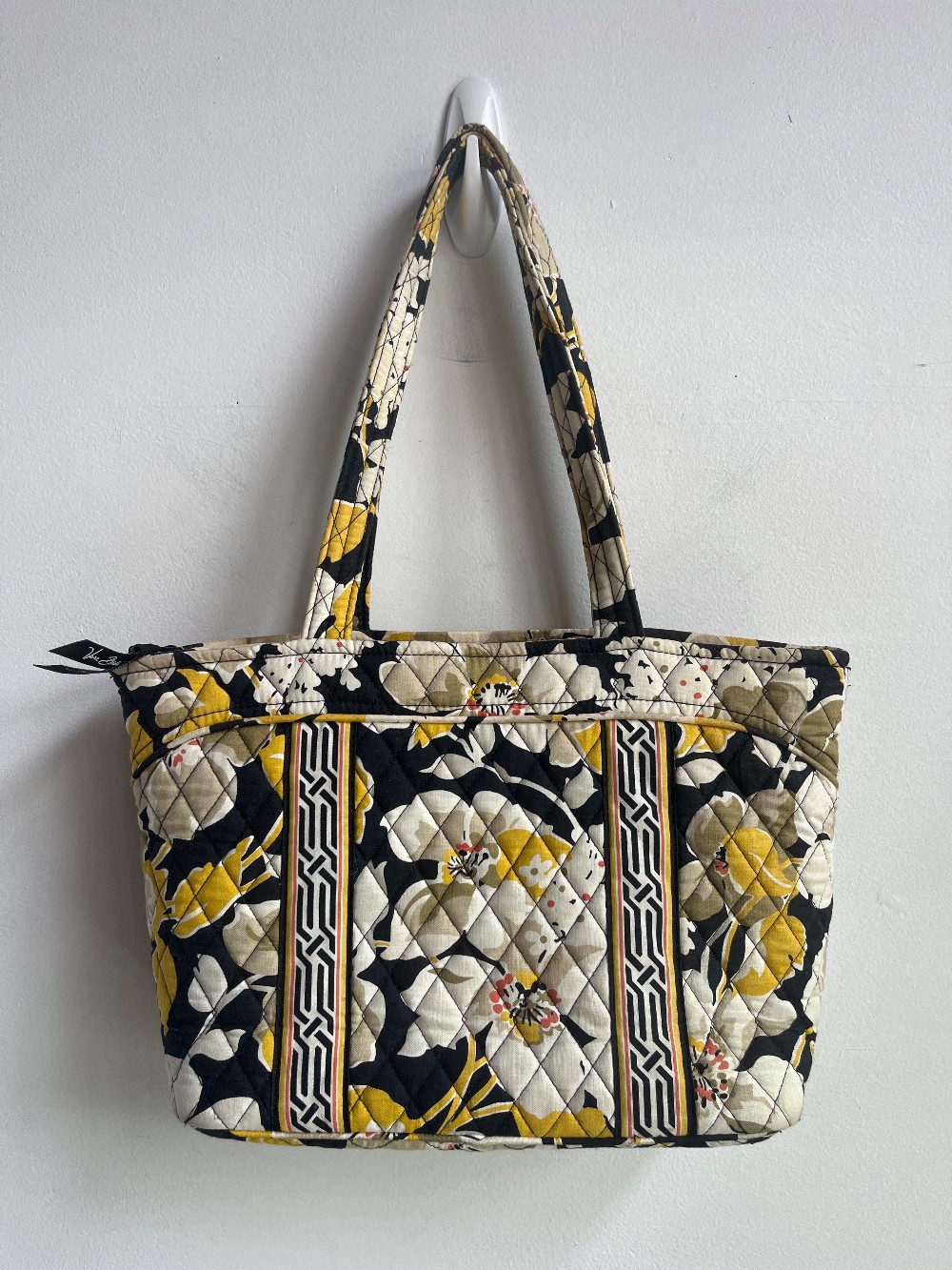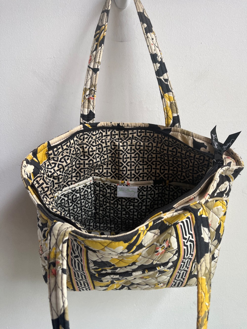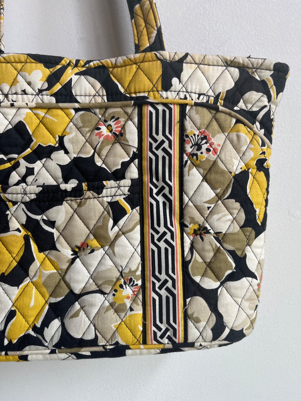 A cream, yellow and black tote bag with a structured bottom and zip top. Features 6 inner slip pockets and one outer.