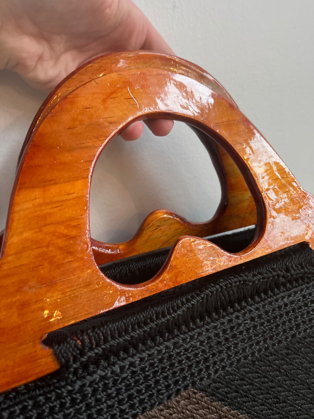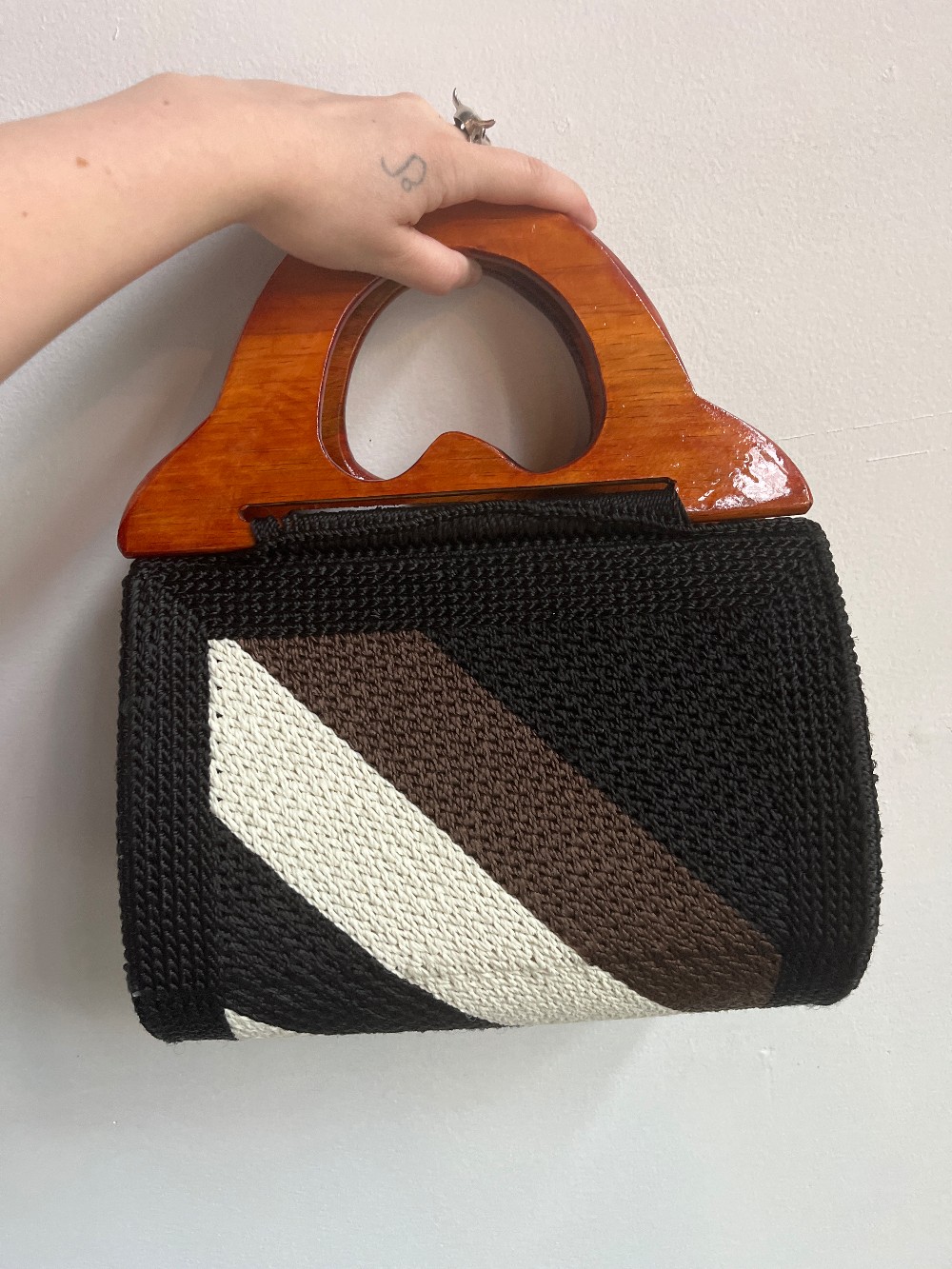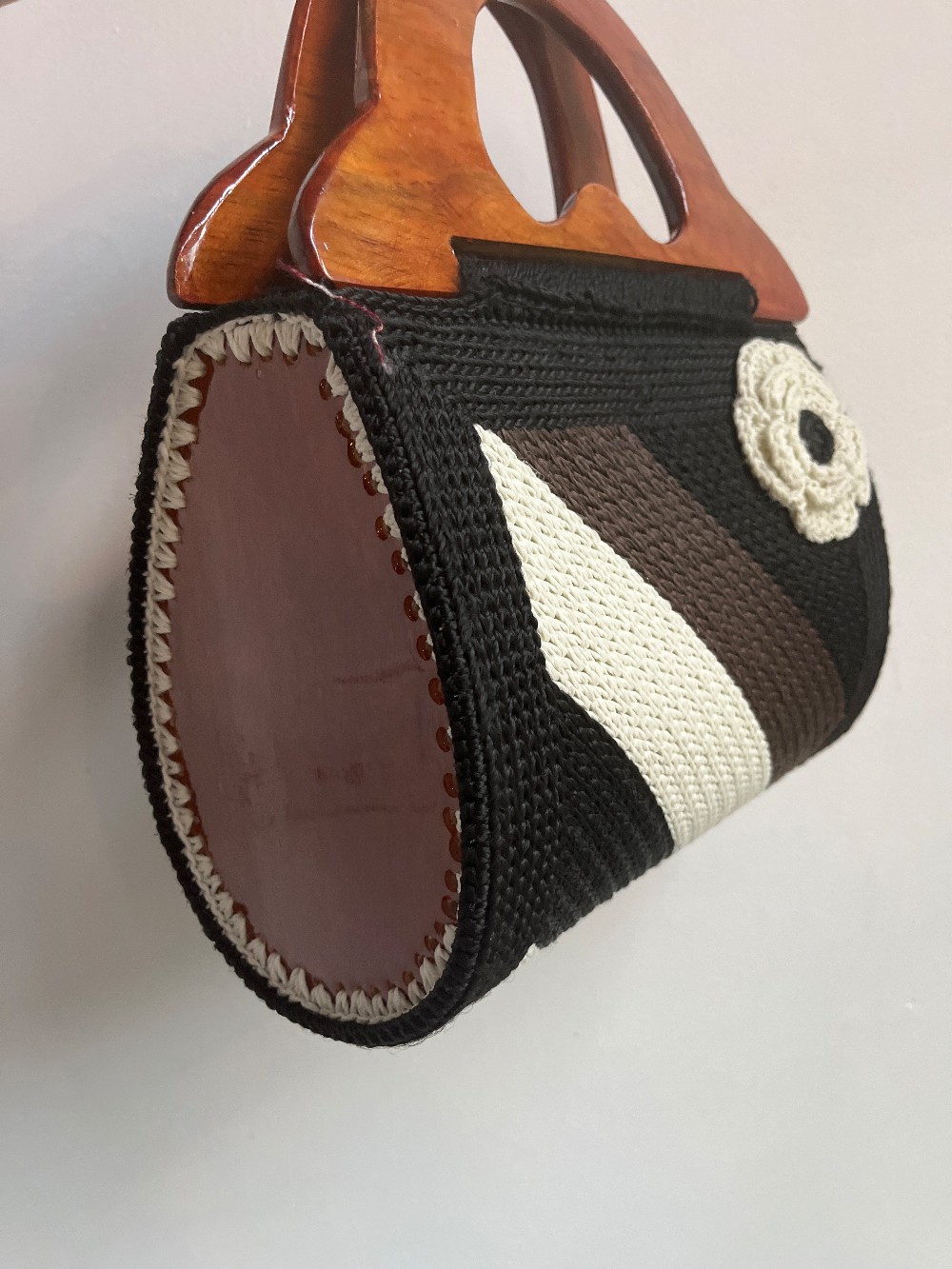 One of a kind, retro hand bag with a zip closure, inner lining, outer woven stripes and embroidered flower. Outer is hard and protective.