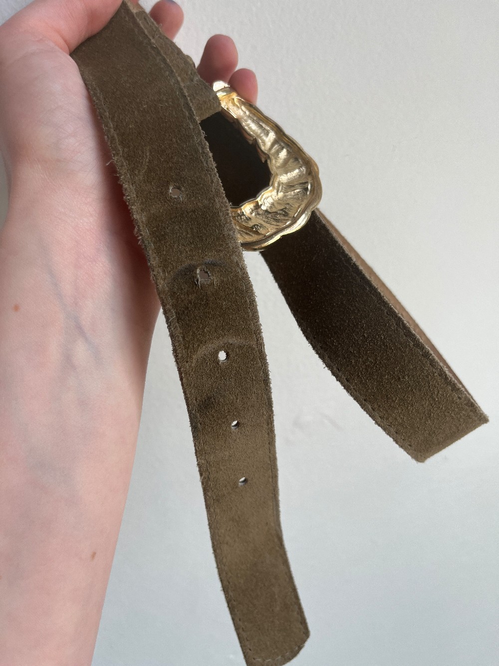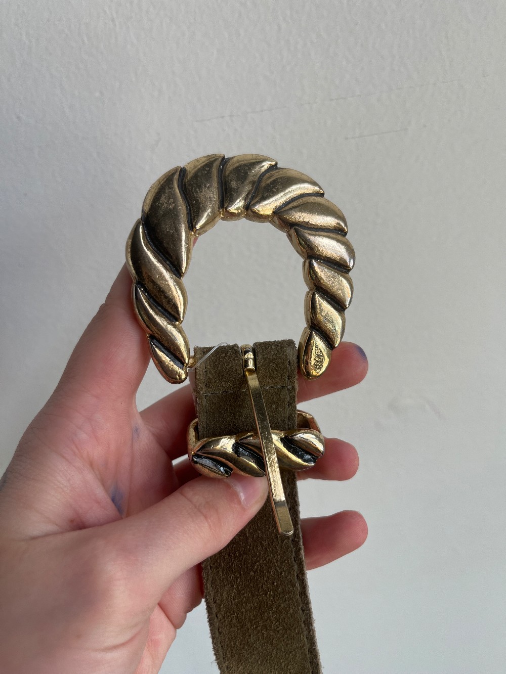 Vintage, made in Canada from genuine leather! A pretty golden hard wear buckle and a soft olive green suede fabric.