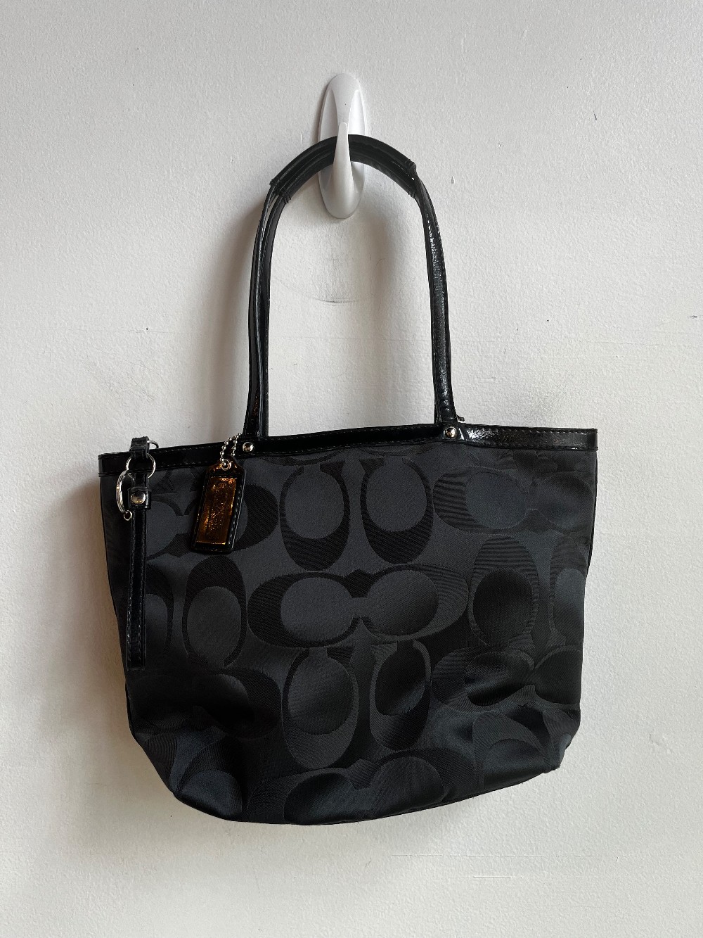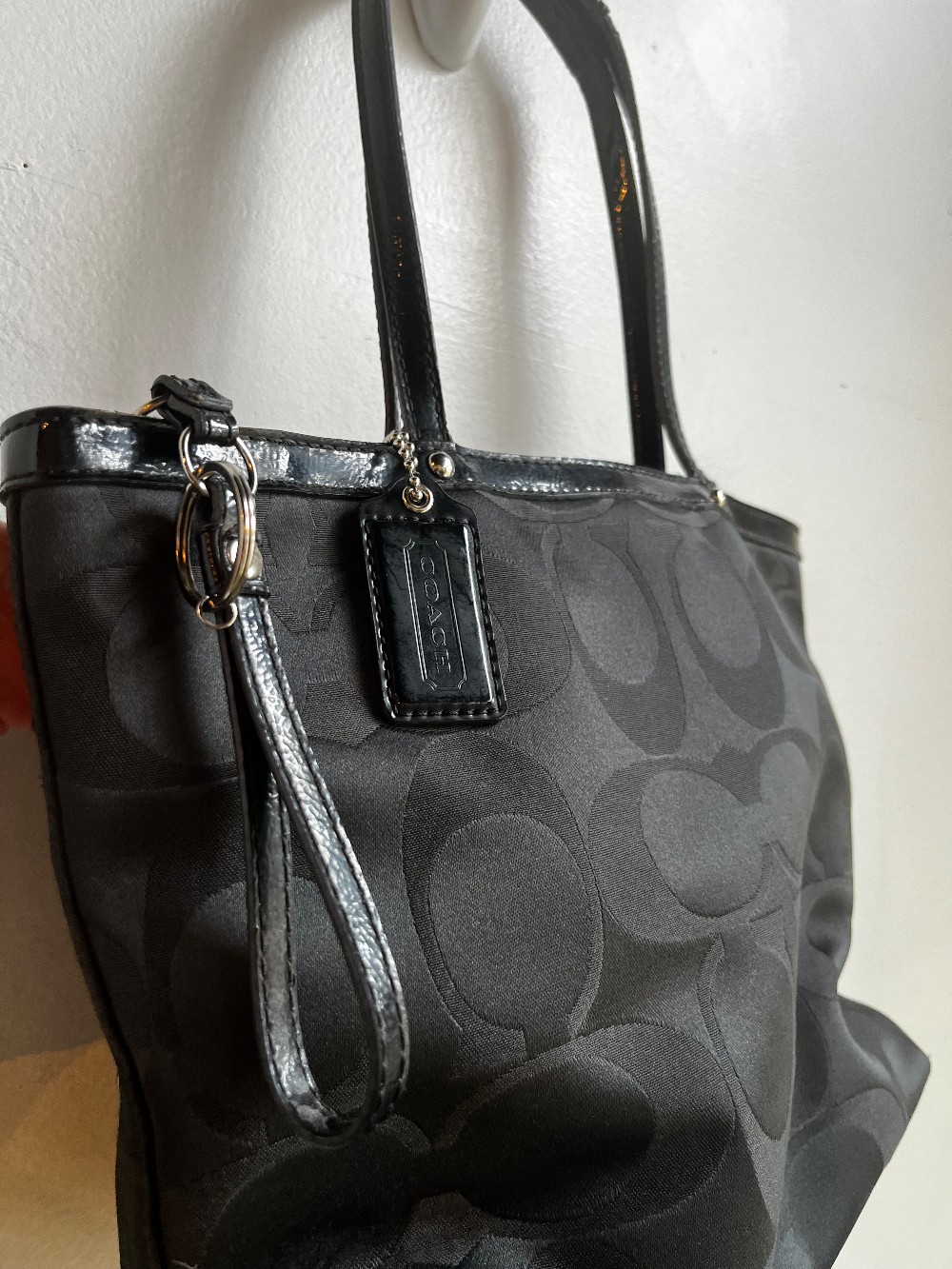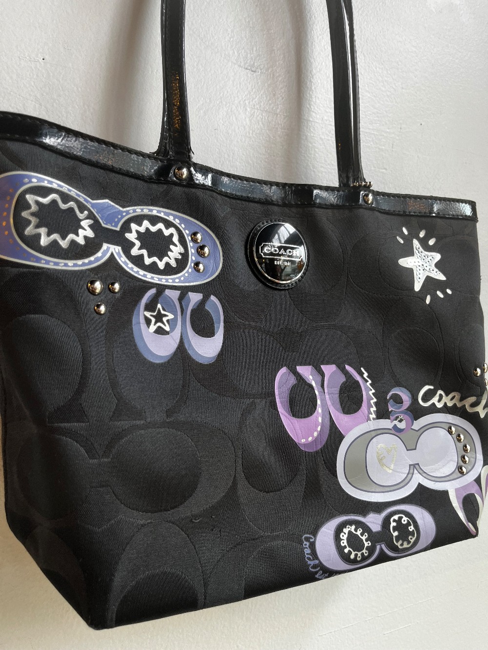 Black Signature Appliqué. Patent leather handles and trim. Features colourful graphics and silver hardwear. Has a purple lining with two slot pouches and one zip compartment.