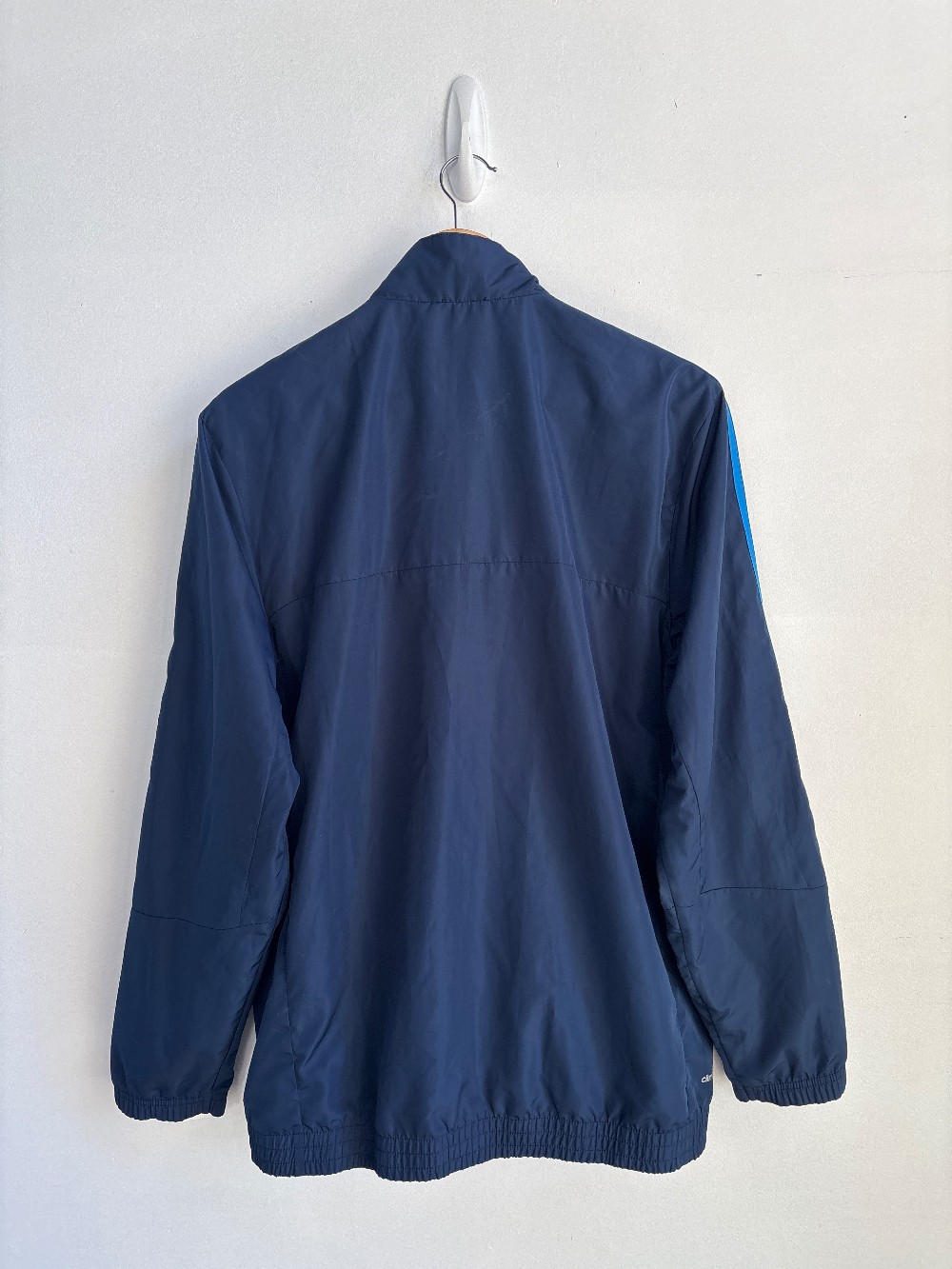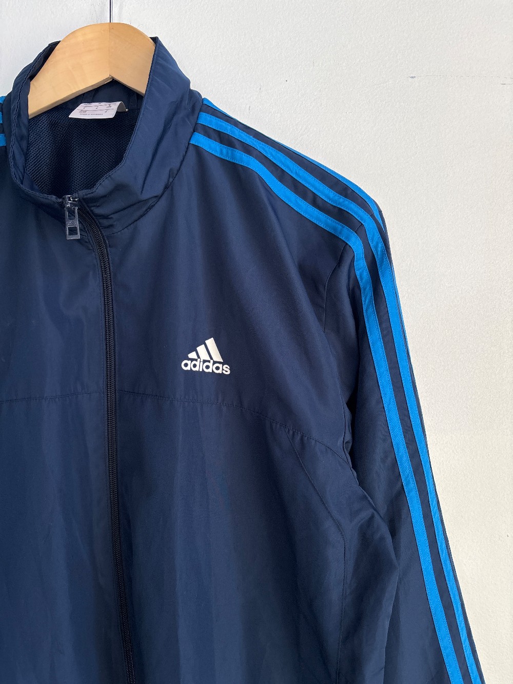 A classic warm up windbreaker zip up Adidas jacket/ The sleeves have the classic Adidas 3 stripes in blue. The sleeve cuffs are elastic and the waist hm is also elastic. The interior has a mesh lining. Perfect for warming up and being stylish.