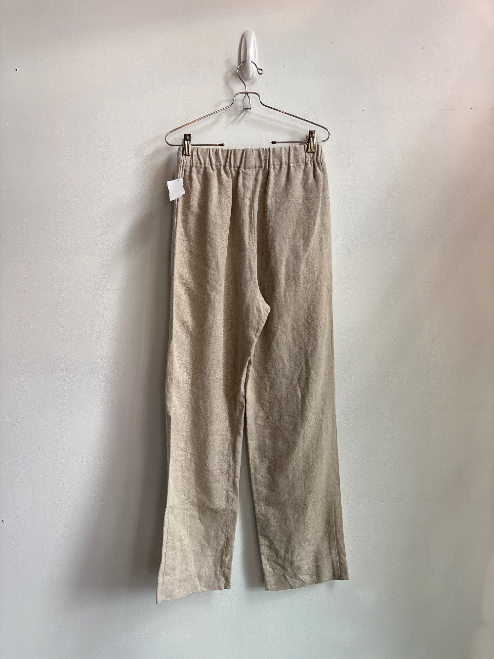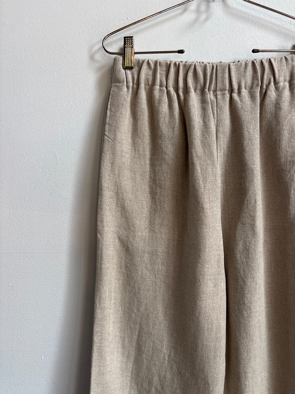 “Designed and handmade in Vancouver, Canada. Support timeless, seasonless, and ageless slow fashion. Unisex, high-rise, relaxed leg, French linen pants. Featuring signature slash pockets, and pull on, elastic waistband. Oeko-Tex Certified.”
