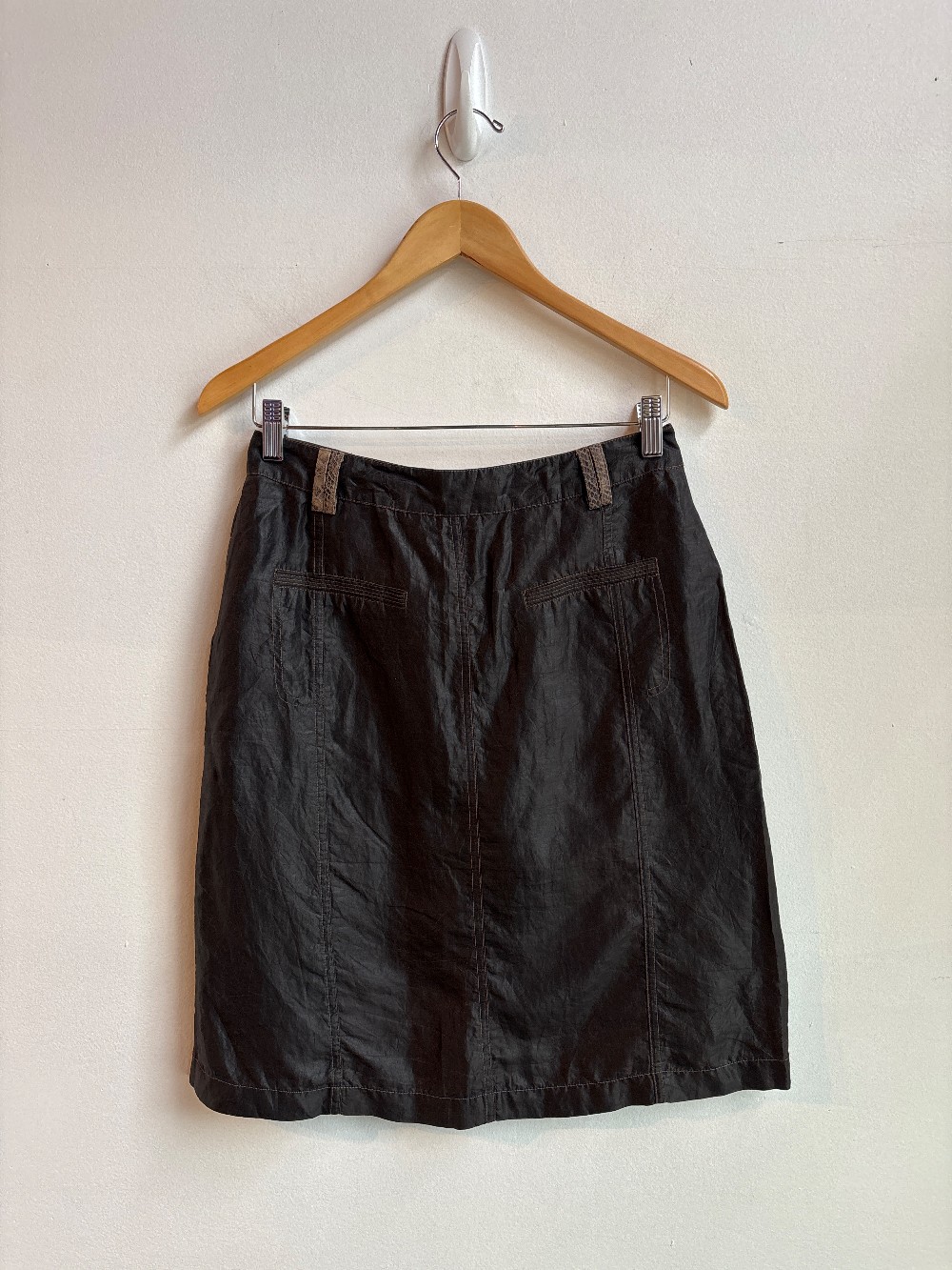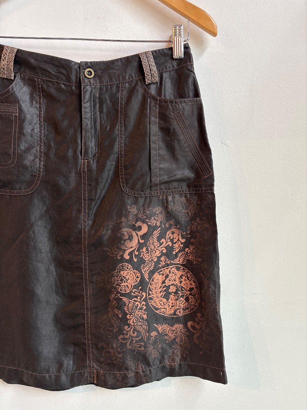 A cargo styled midi skirt with 2 side pockets, a zip fly and thick silk material. Has an intricate print pattern on the front