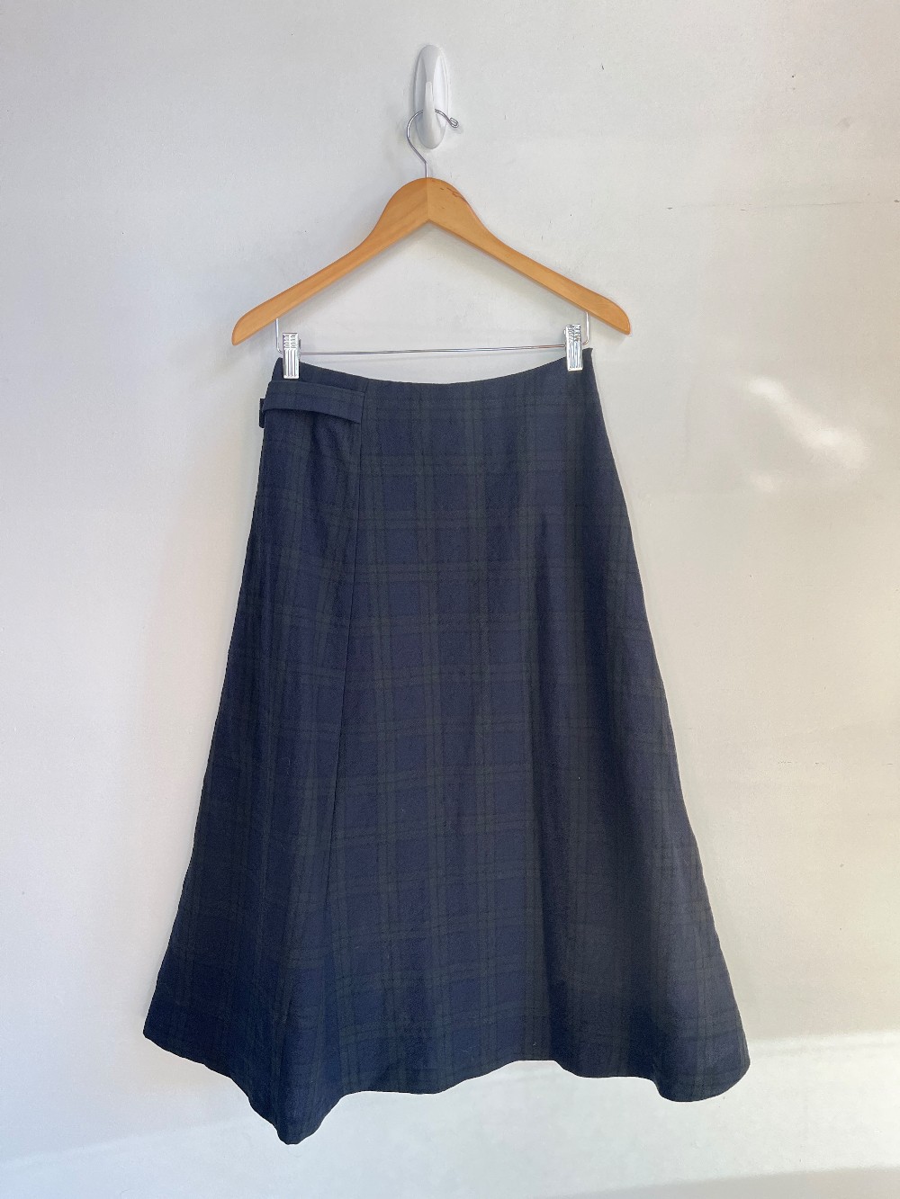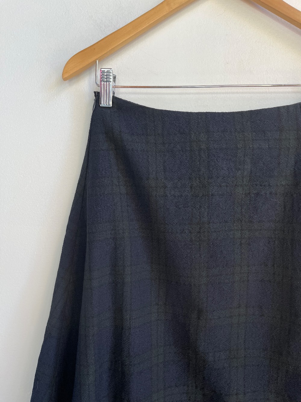Combination of wool and mohair! A beautiful navy and green plaid maxi skirt with pleats and a belted waist. Features a black inner lining.