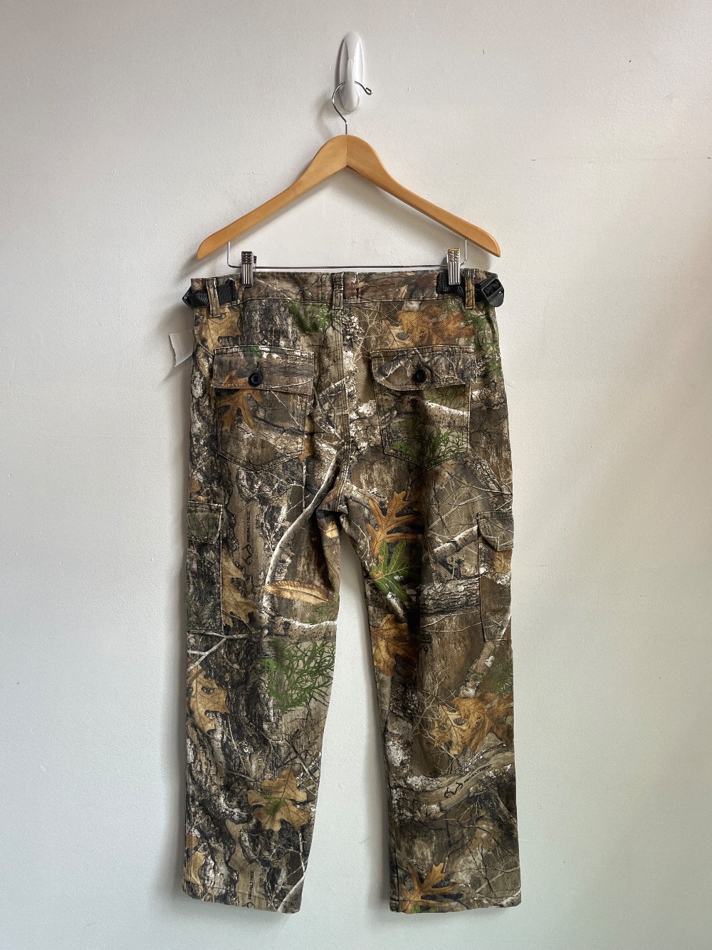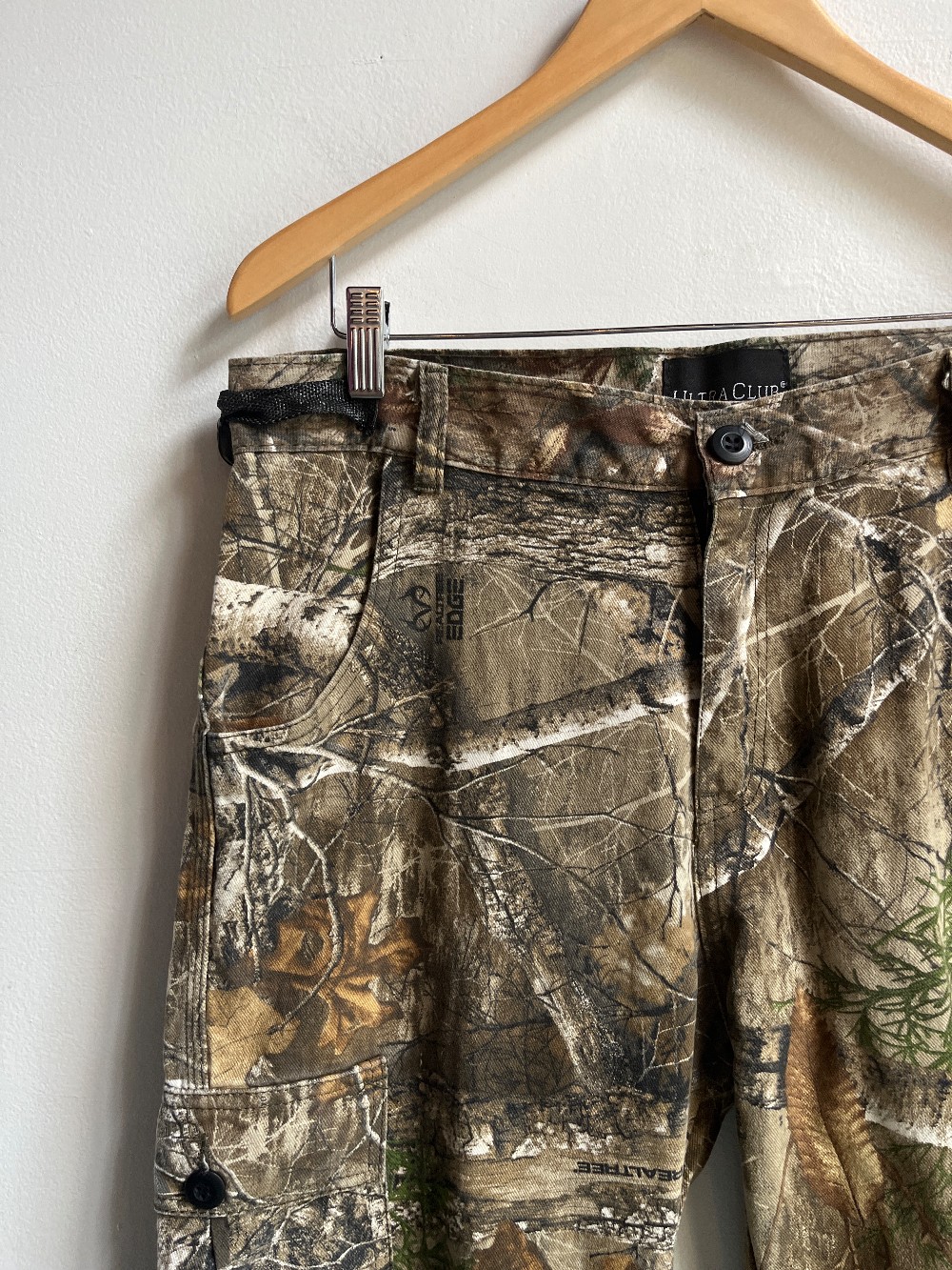 Adjustable side cargo pants with a green real tree print. Features a zip fly and pockets.