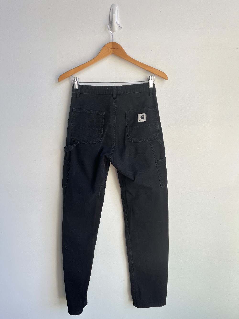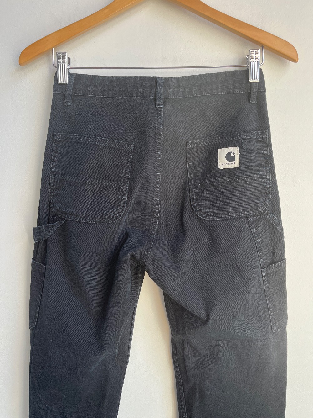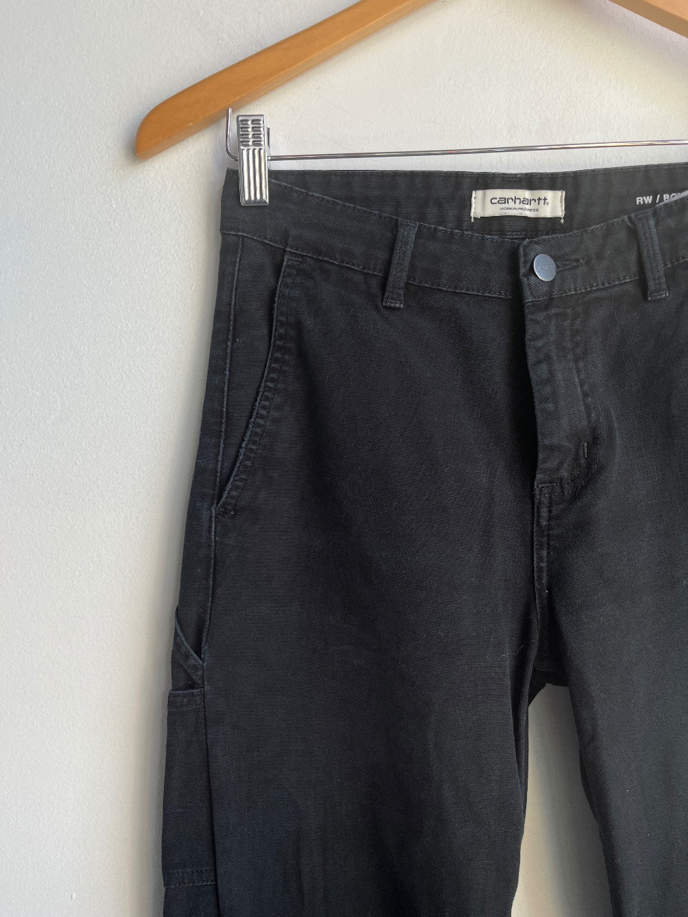 Casual cargo pants with a high rise, 4 pocket styling, zip fly, side leg pocket and hammer loop. Fabric is cotton with some fading