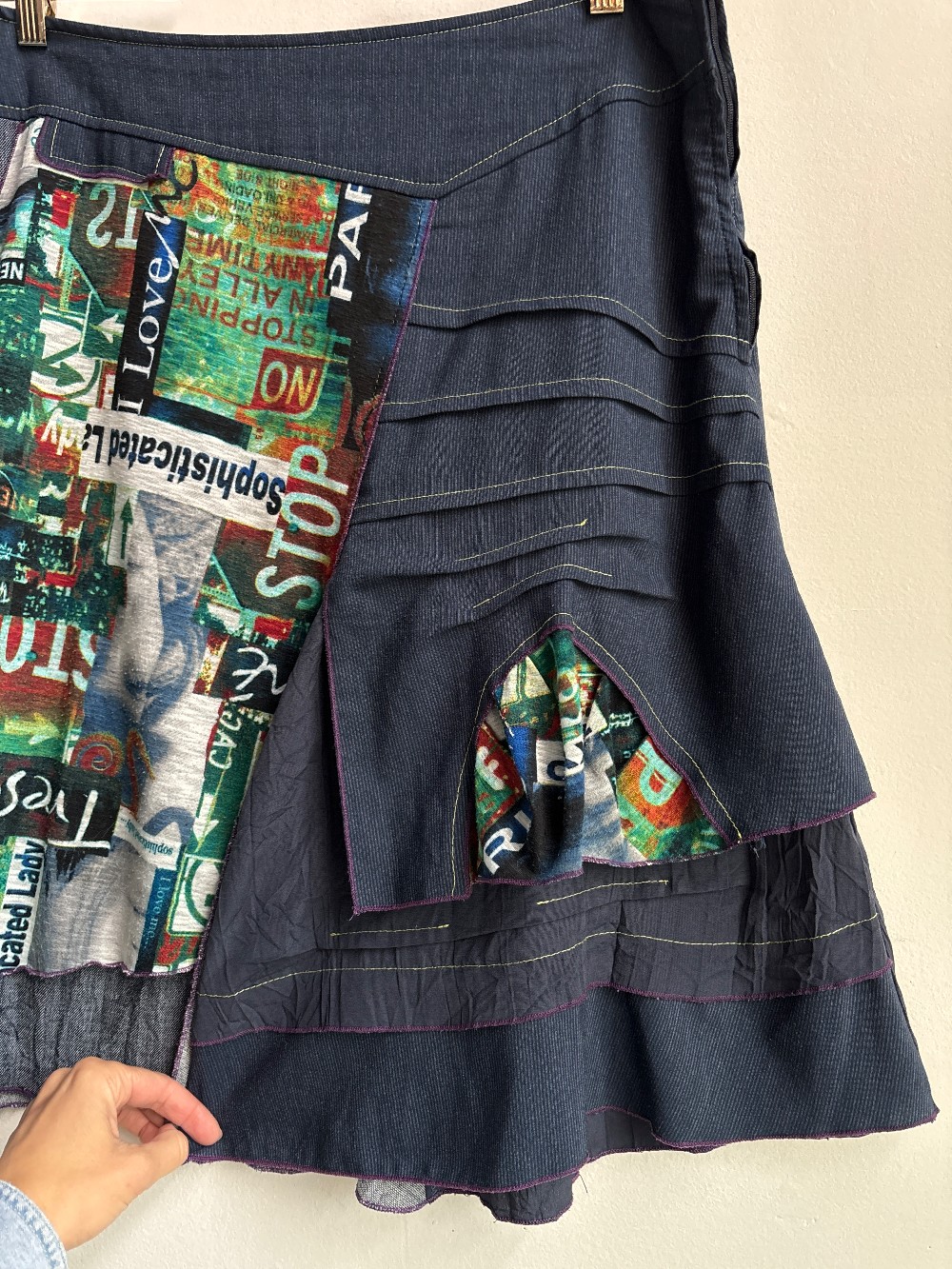 AS IS: Some pilling on part of the fabric. The size on the tag is 44 but measures 32” at the waist. This is a unique piece with lots of funk! The skirt features patchwork style assortment of fabrics and textures. It has an asymmetry style with horizontal sewn pin tucks on the left side with contrasting light green stitching and ruffled layers. It has a side seam zipper closure.