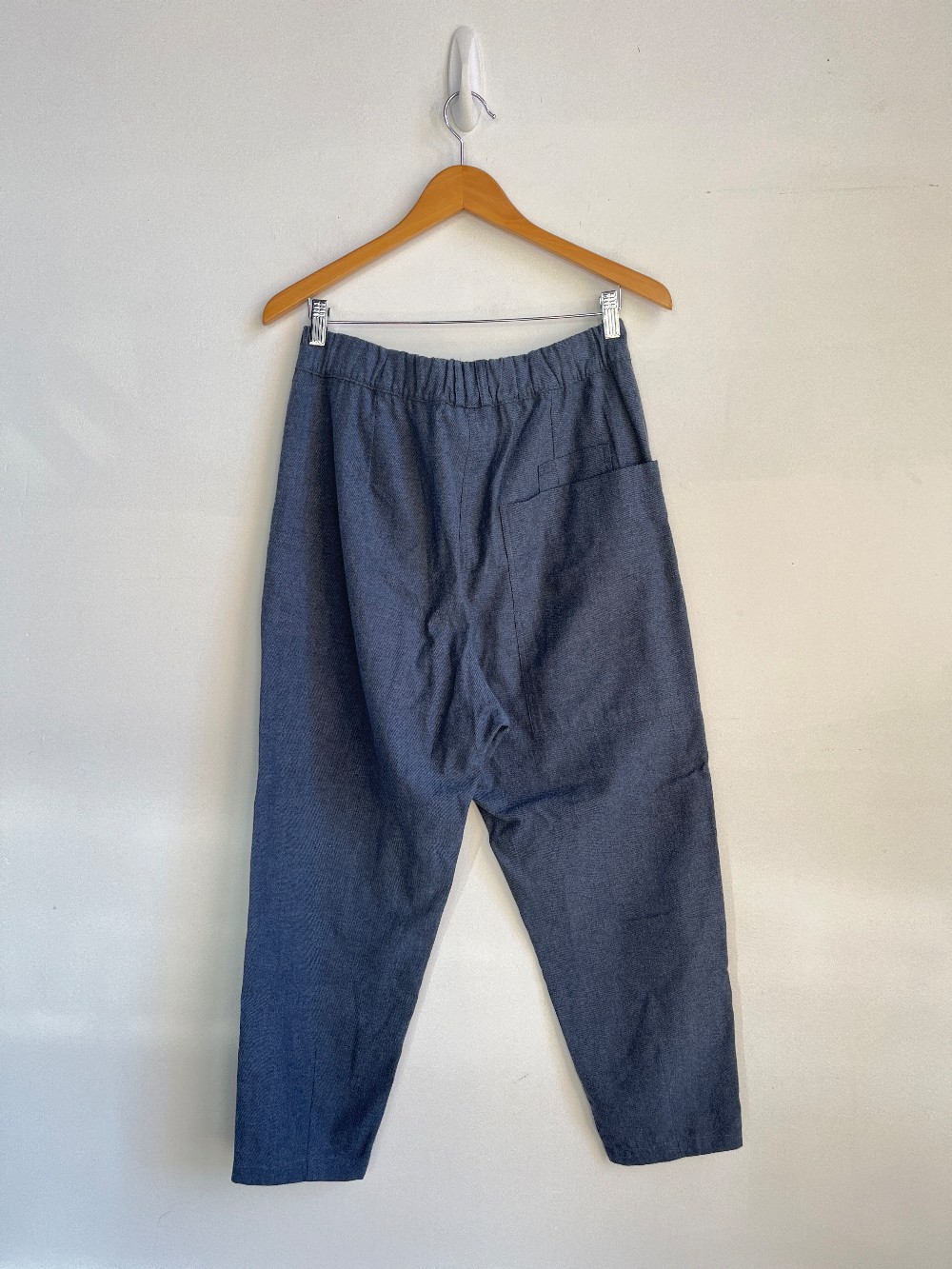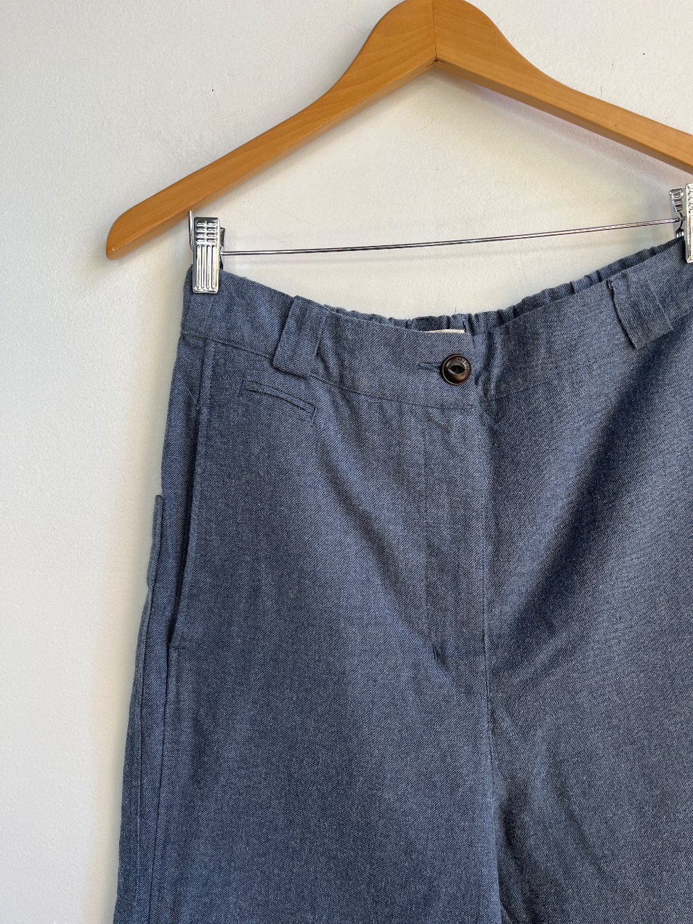 A pair of soft wool trousers in a steel blue toned colour way. Features a zip front, two pockets, and thick belt loops. Fits with a tapered leg and a high rise waist.