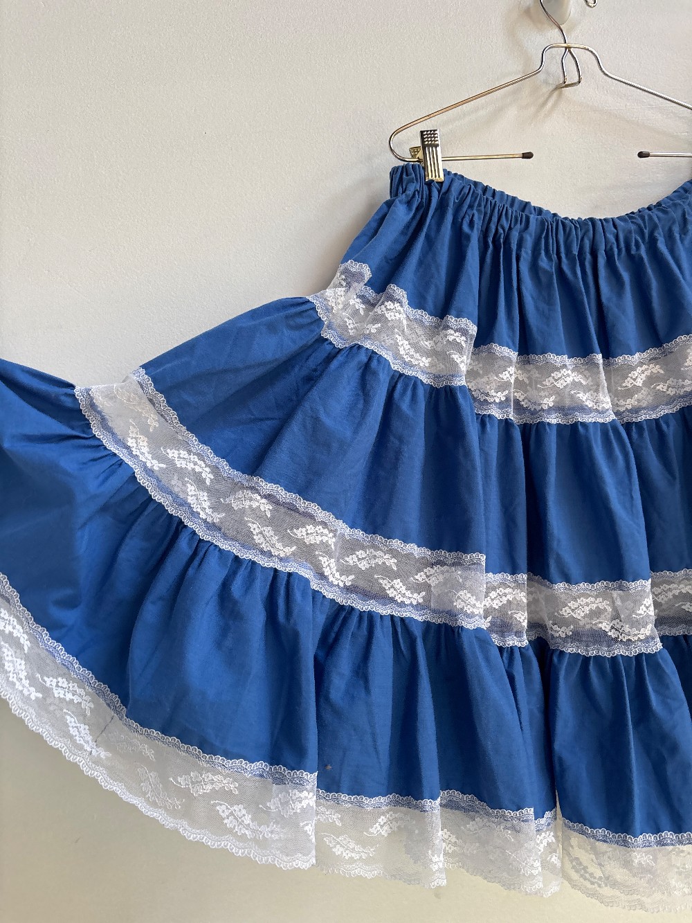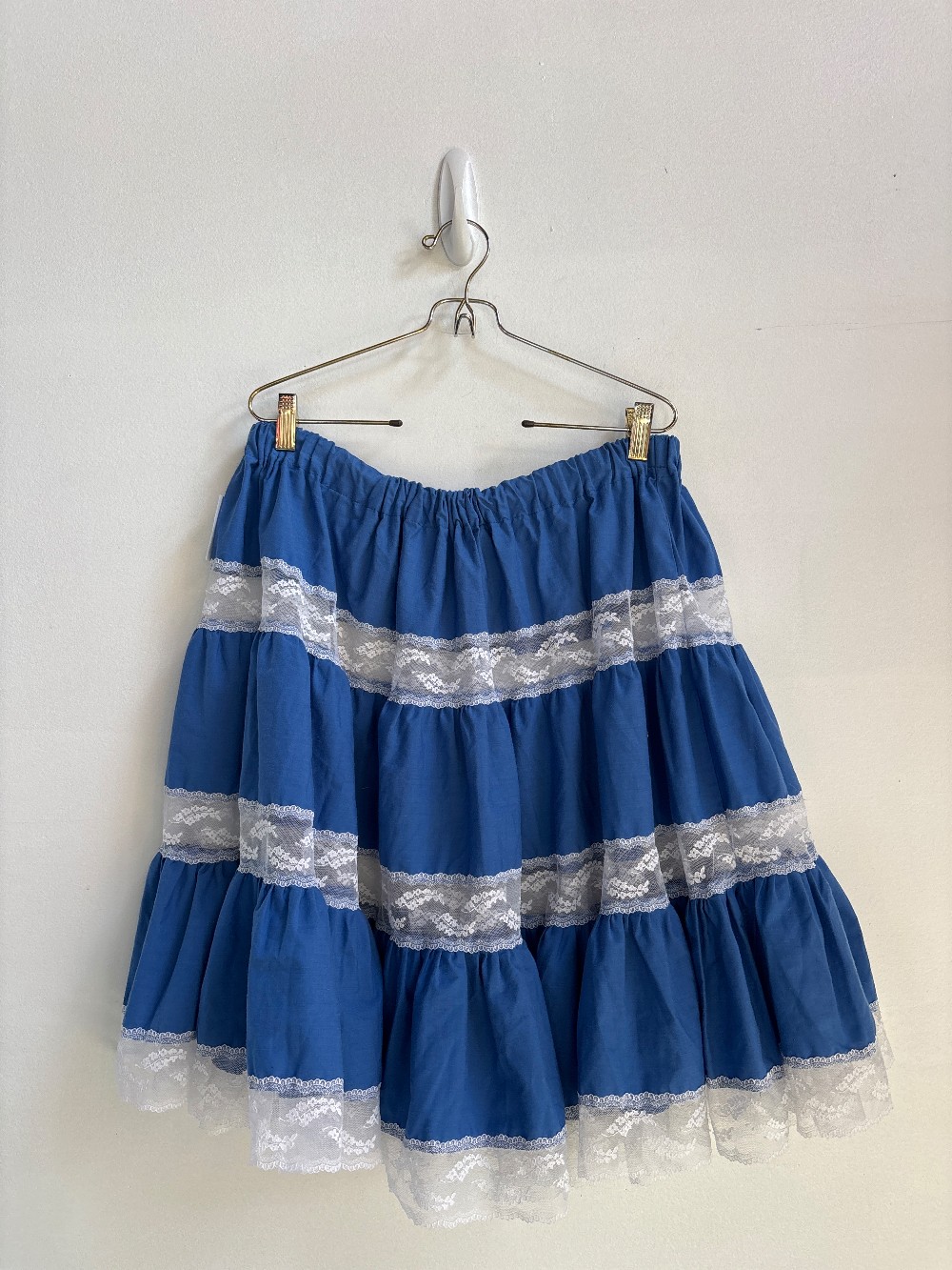 A fun blue and white lace midi skirt with a flouncy style and an elastic waist band. Fits midi!