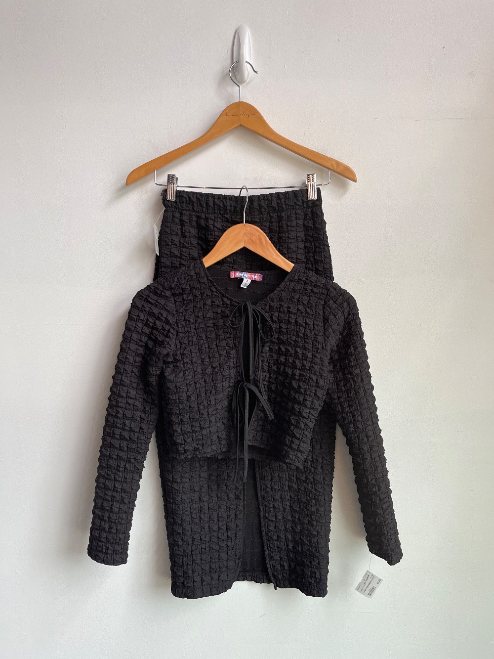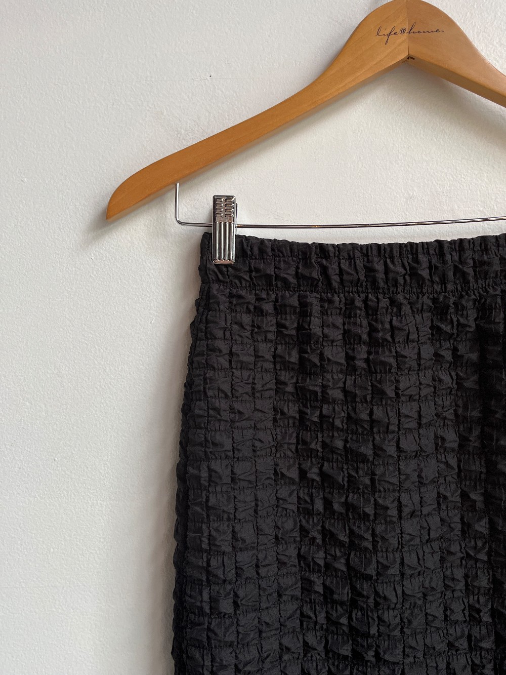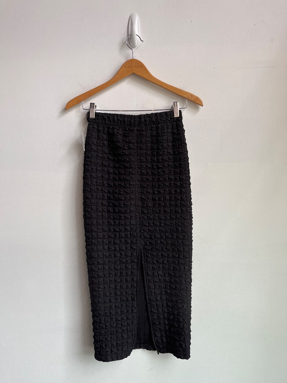 Matching top in store! A puff skirt with square detailing and a fun texture. Features an elastic waist band and a slit up the back legs for better movement.