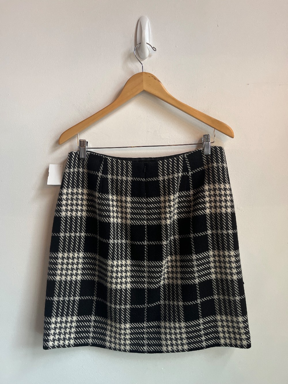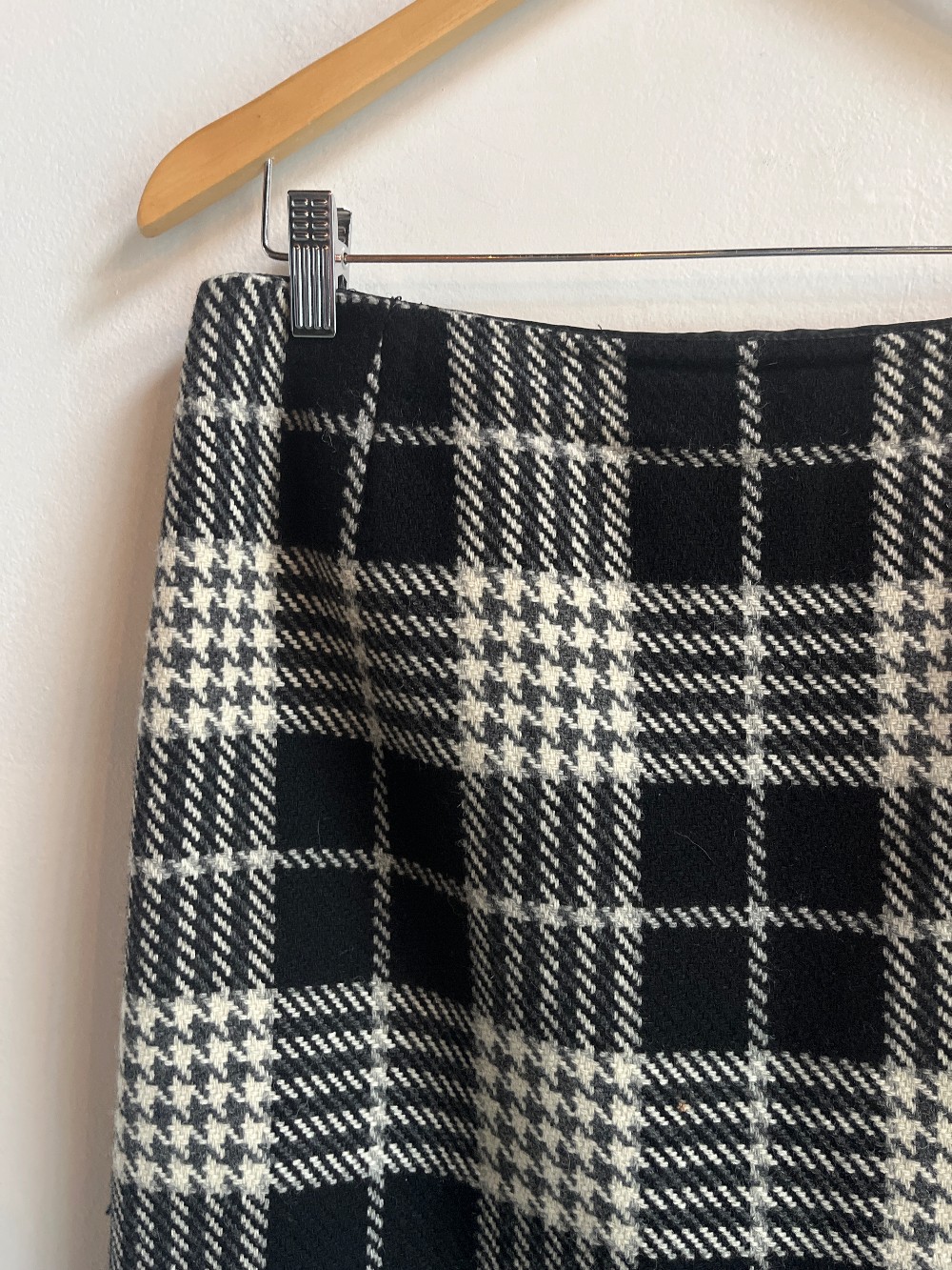 A fitted mini skirt with a zip back closure, inner lining and wool blend plaid outer. Skirt has no stretch