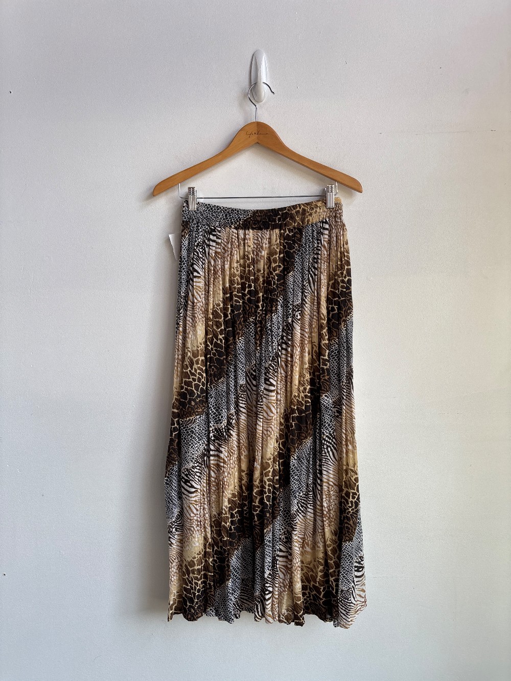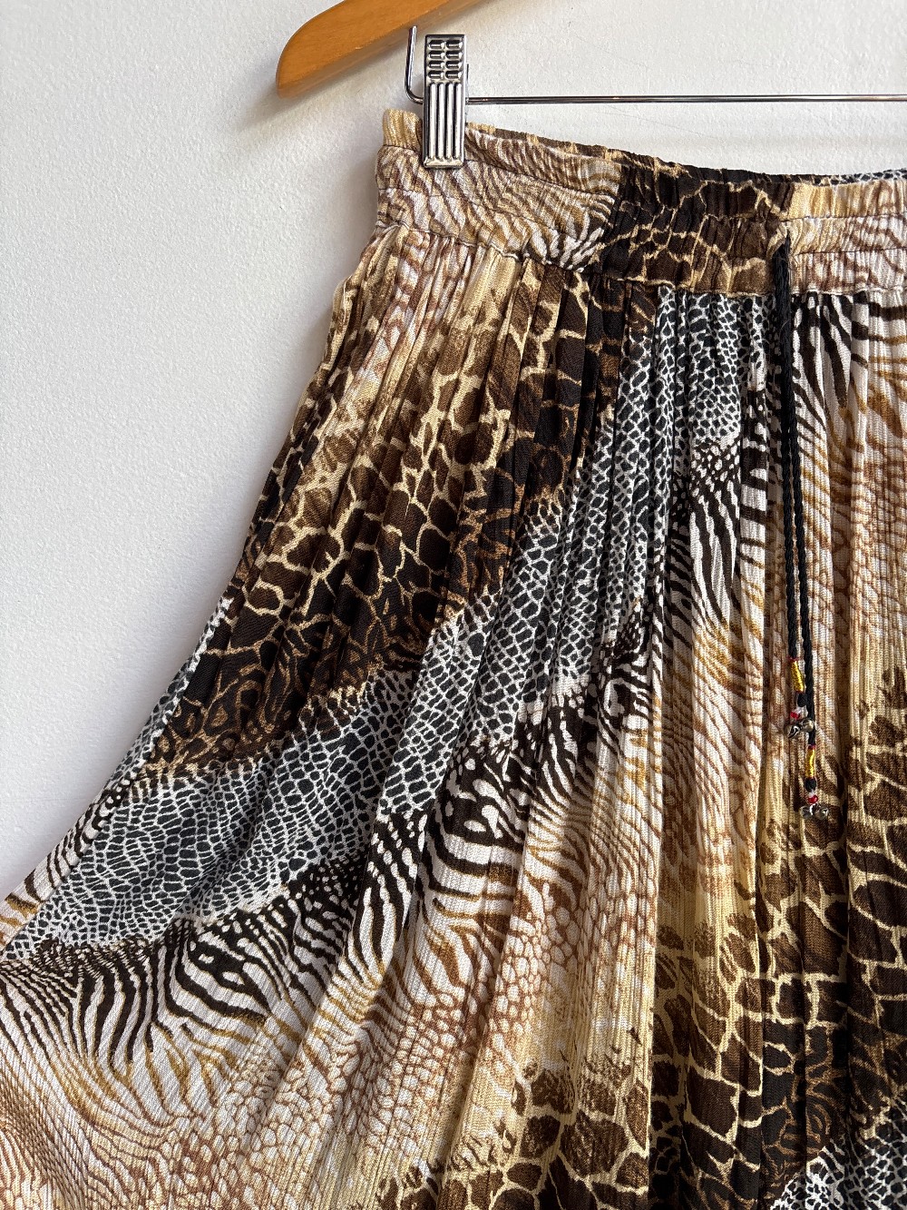 The waist band is very stretchy and also has a drawstring, so sizing can be from XS to possibly a L. Multi-print animal skirt with a flowy gauze like farbic.