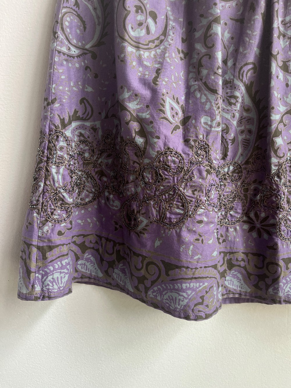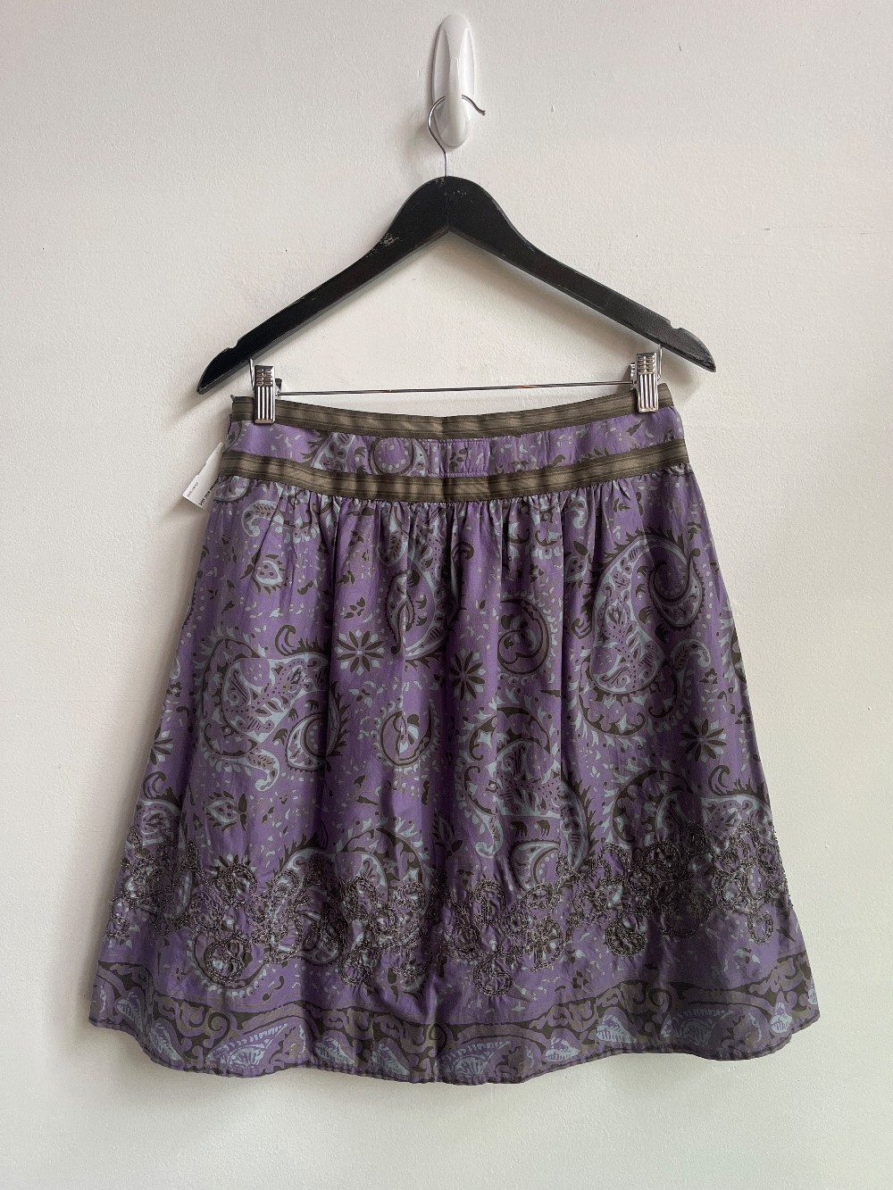 A pleated mini skirt with green bands along the waist line and embroidered beads along the bottom hem. Features a zip down side.