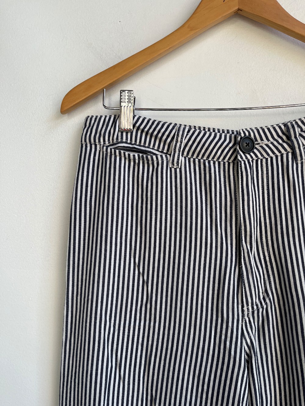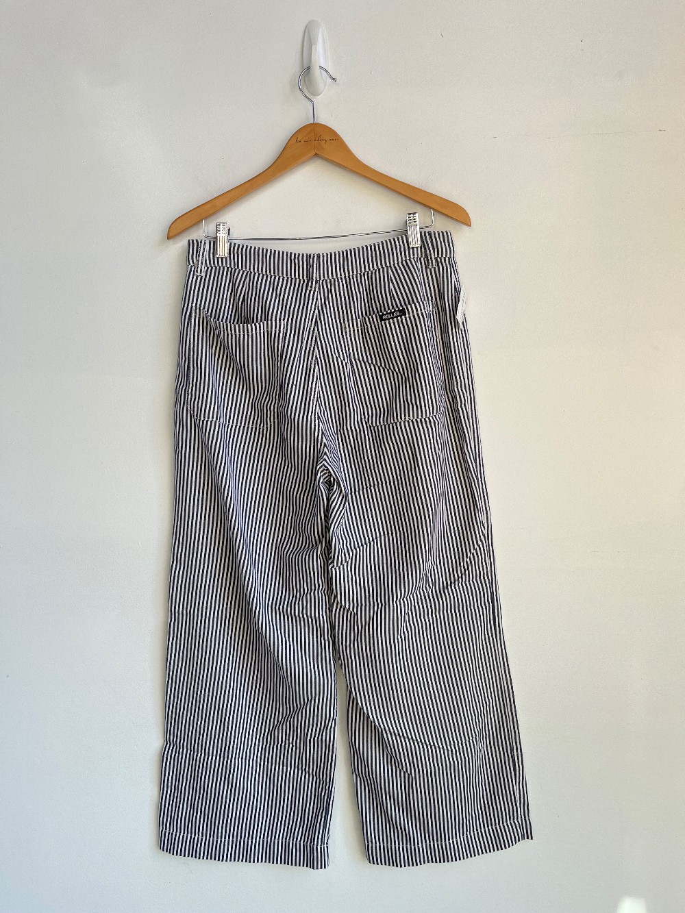 “ One of ROLLA'S most popular styles, the Sailor Jumpsuit, now comes in a pant version the Old Mate. A high rise, wide leg pant in softly washed, 100% cotton yarn dyed navy pinstriped cotton. Gradually falls to a wide-legged-silhouette for an on-point seasonal look.”