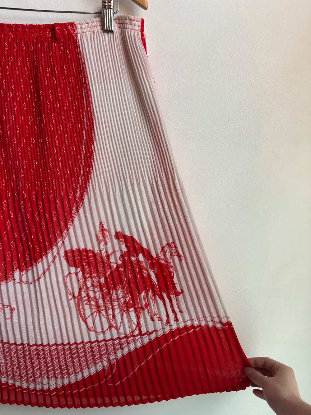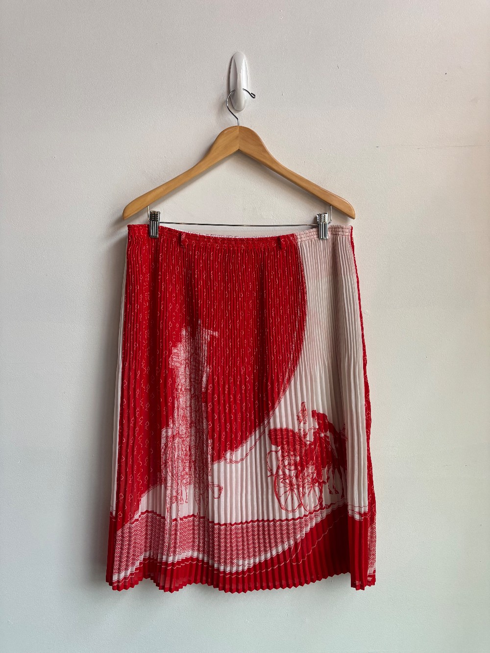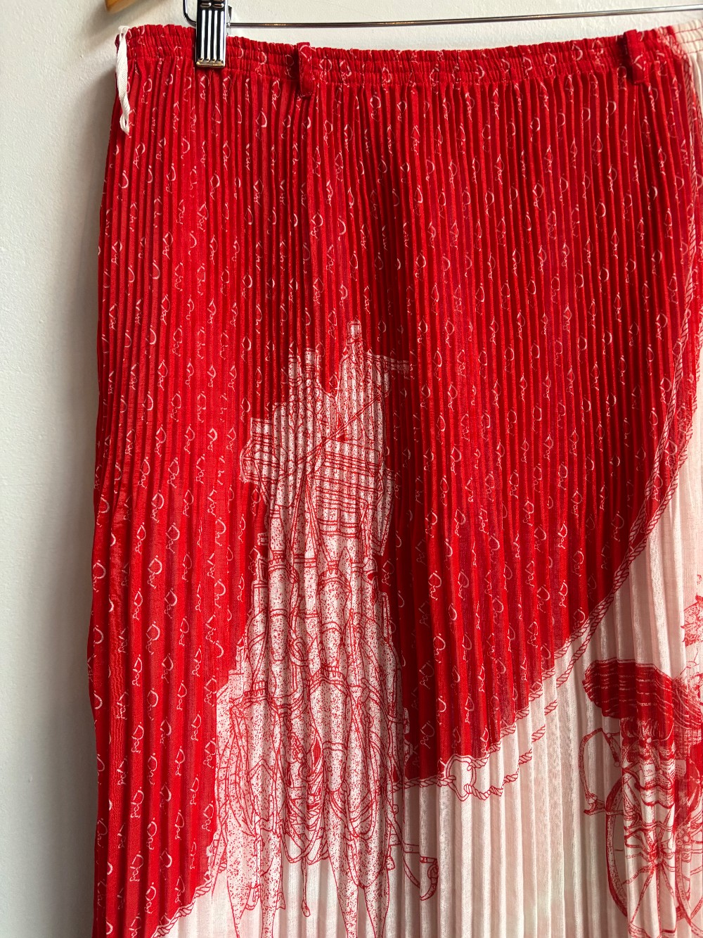 No inner brand, fabric or size tags. Unique midi length skirt with illustrated style artwork on accordion pleated fabric. Has inner lining