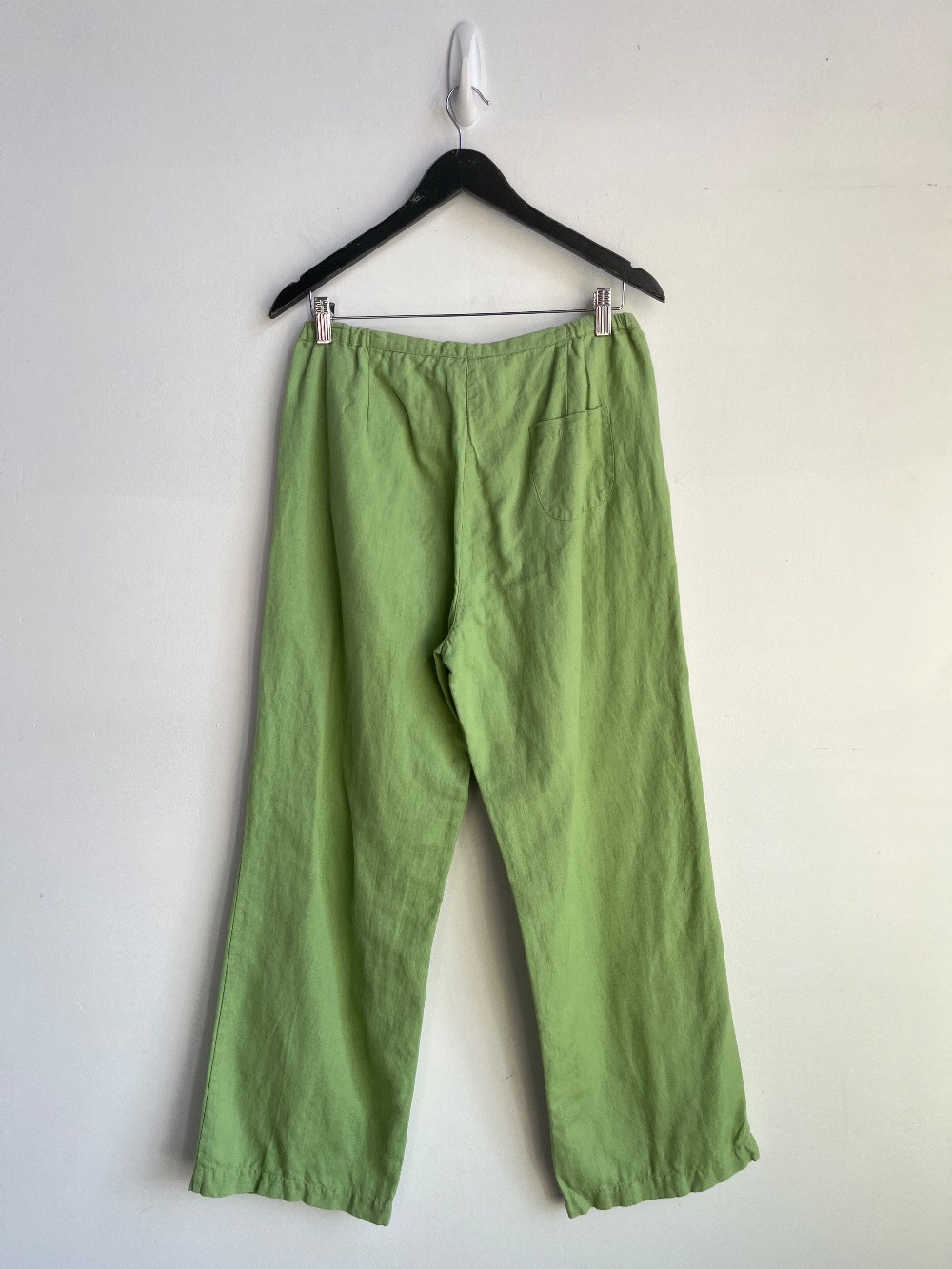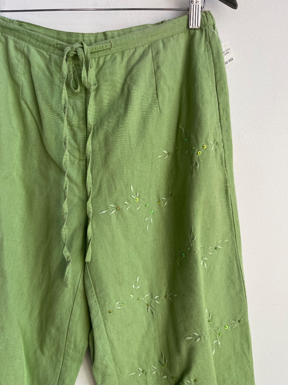 Amazing linen cotton blend pull on pants with a drawstring waist, inner lining, side pockets, tapered legs and embroidered details with sequins