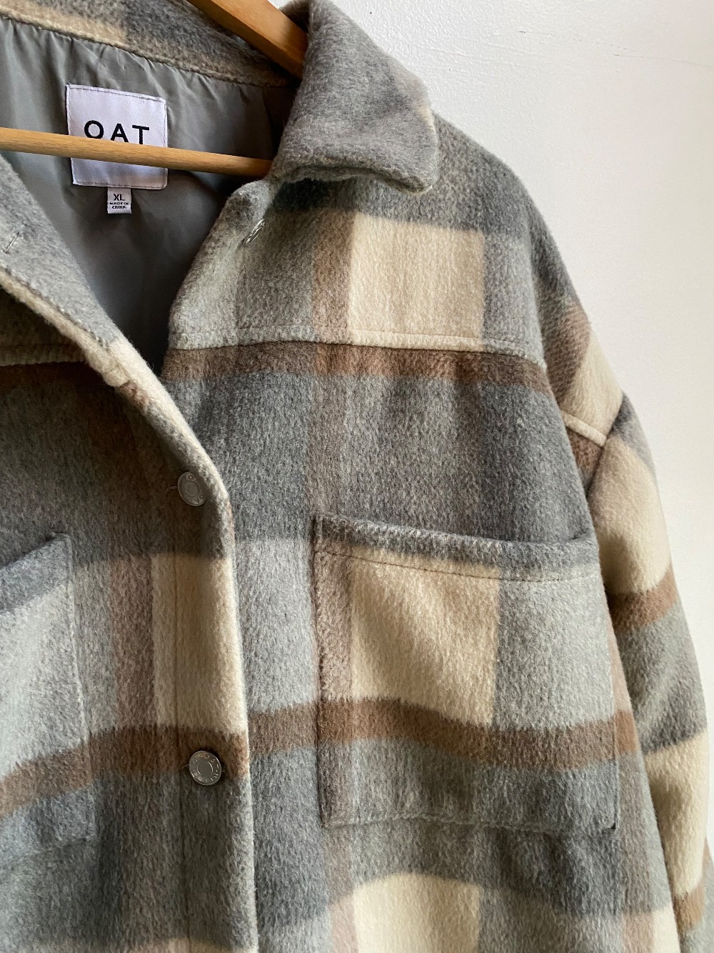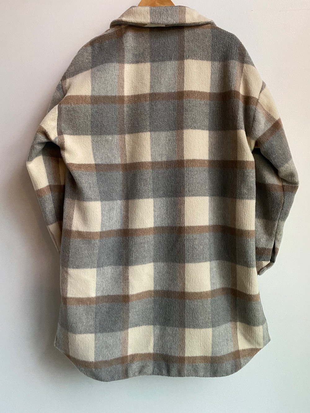 A smooth fleece grey and cream plaid shacket with a hint of orange. Fits with a button down front, two pockets and a point collar.