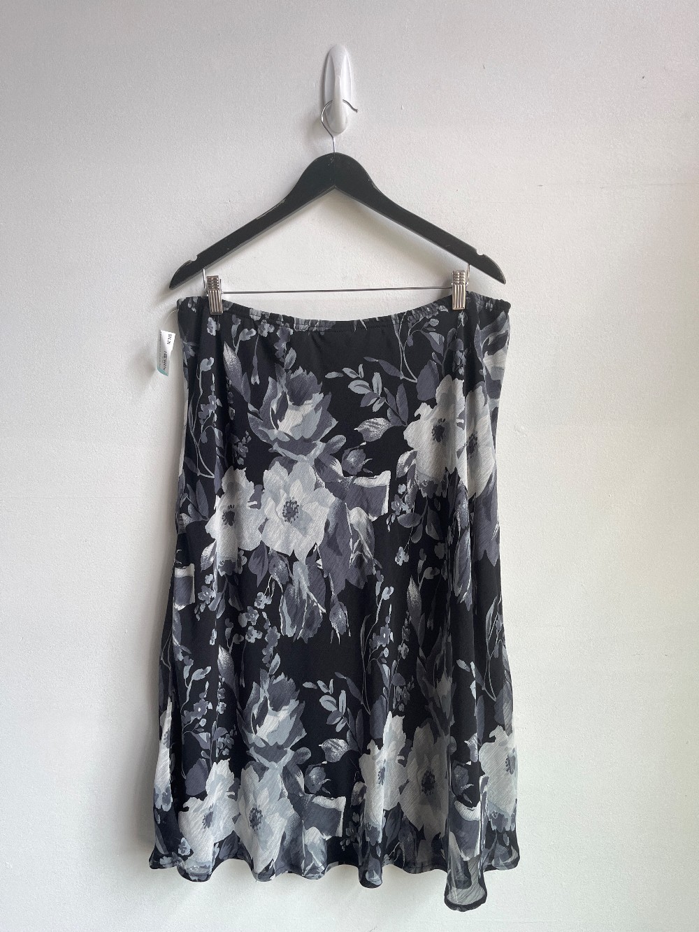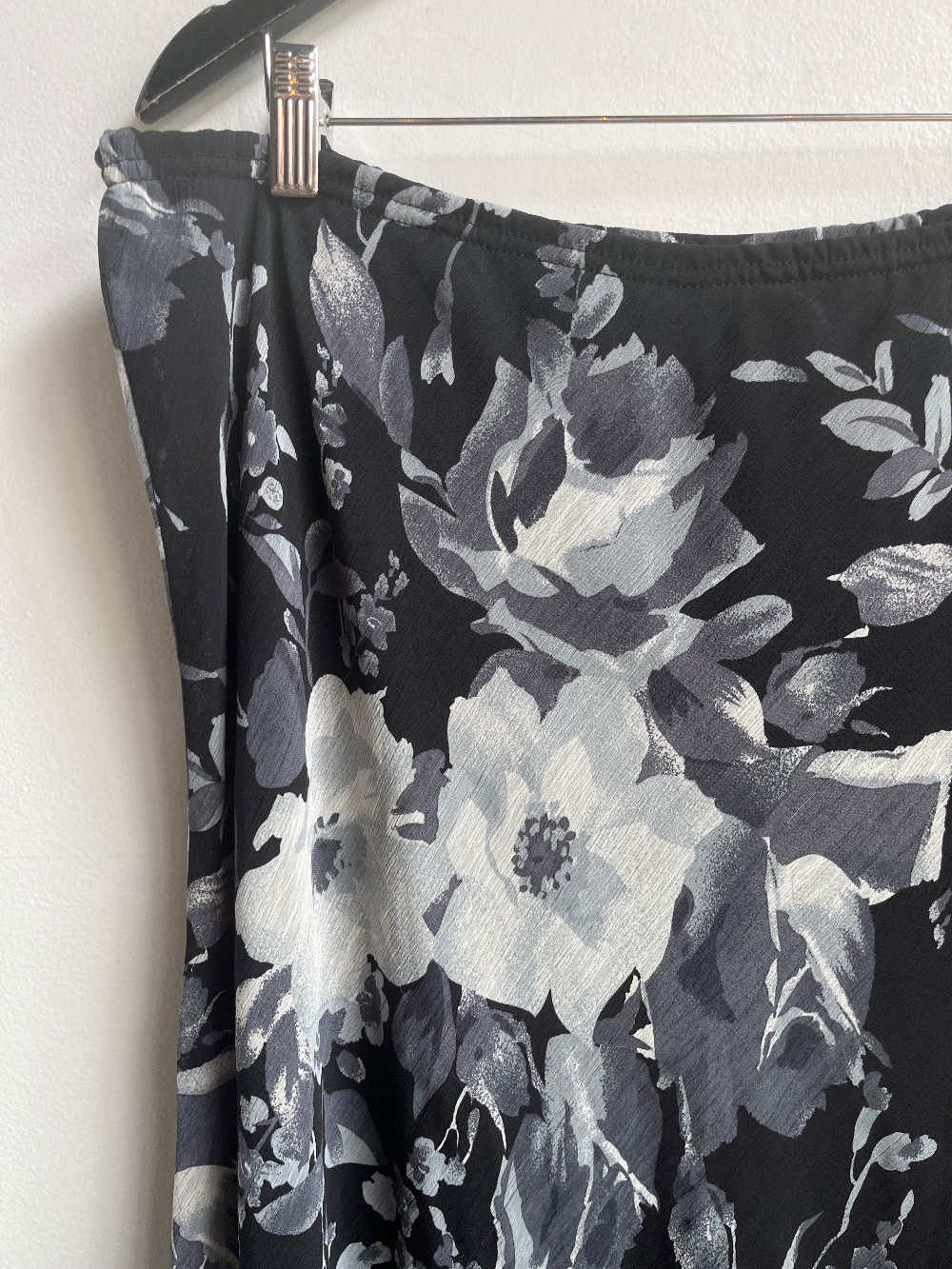 A cute grey and black floral skirt that fits midi. Features an elastic waist band and black inner lining.