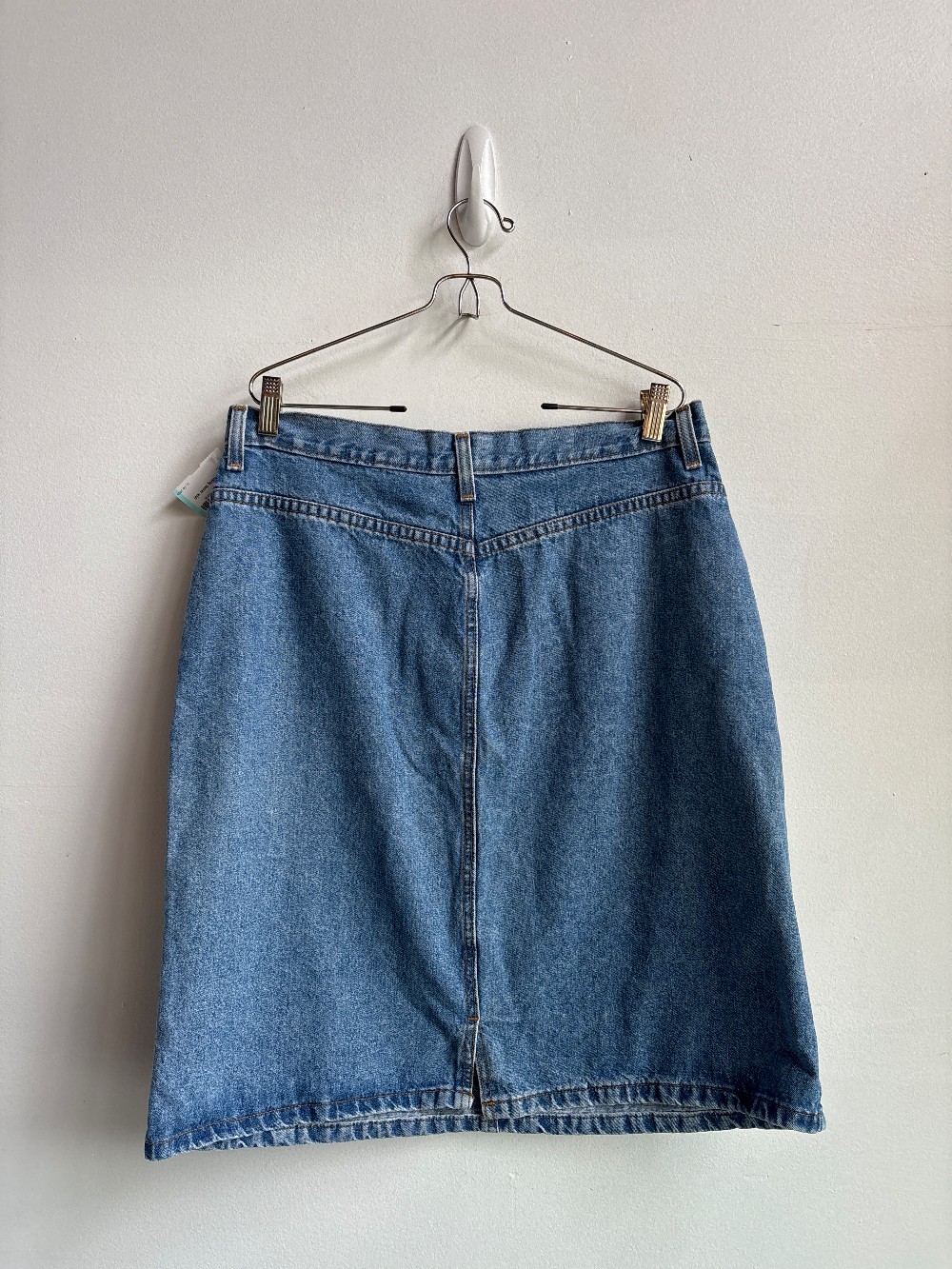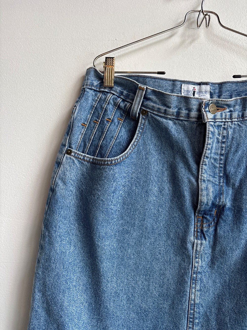 Vintage, made in Canada! Features a cute pleated pocket detail. Cotton denim skirt with a midi length and zip fly.