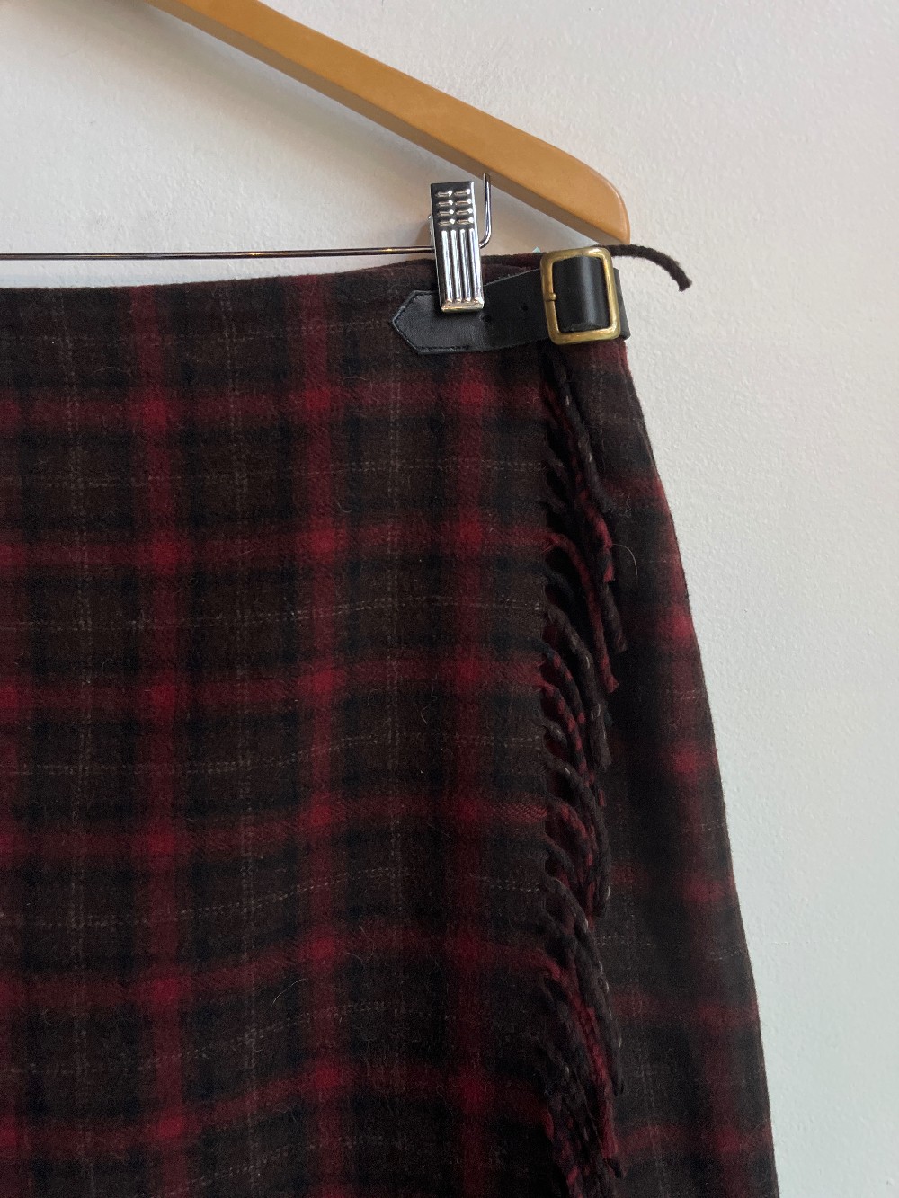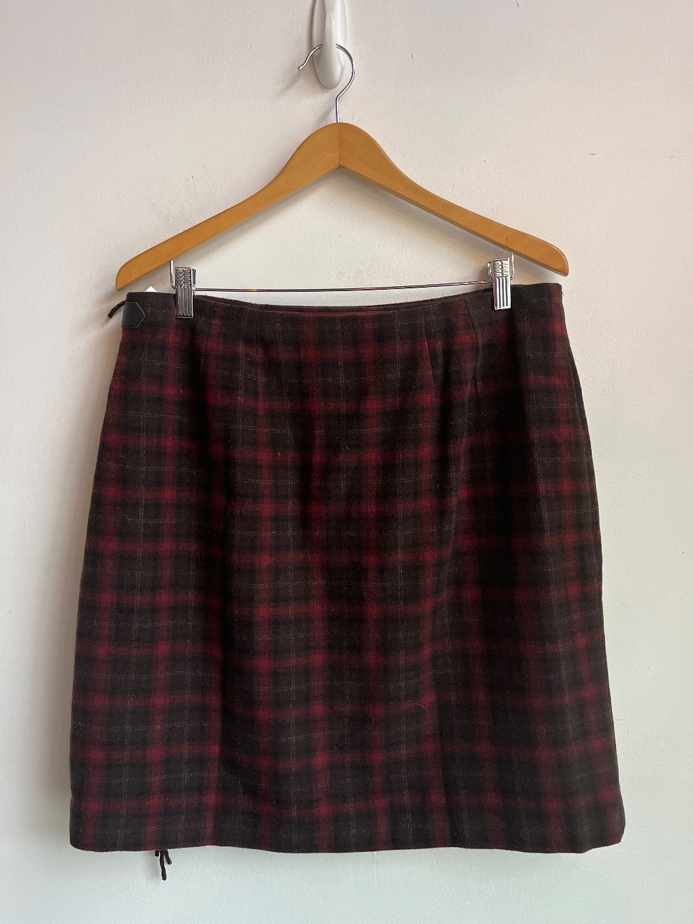A cute blended black and red tartan print with a mixed wool fabric. Features a tassel side, belt hip closure, and red lining.