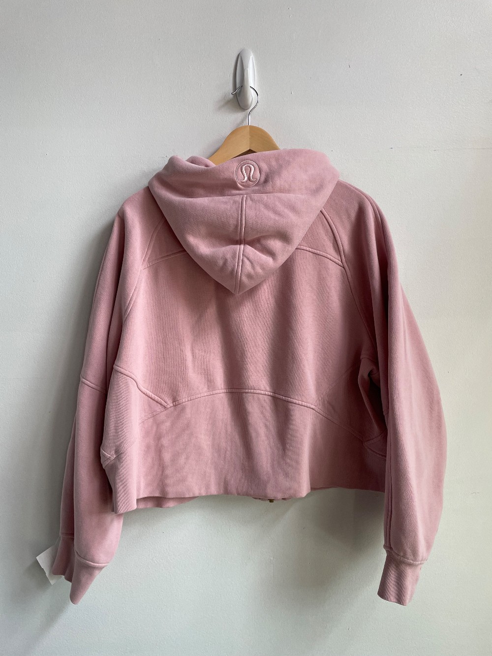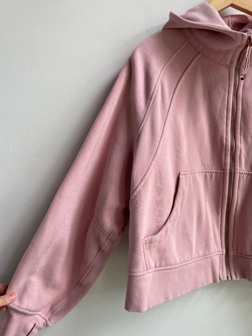 “Light Cotton Terry fabric is lightweight, naturally breathable, and soft against your skin. Oversized fit, waist length. An exaggerated fit that feels extra roomy. Not too short, not too long, just right around the waistband. Zipper garage. Secure front pockets store your essentials. Elastic zipper pull doubles as an emergency hair tie. Thumbholes.”