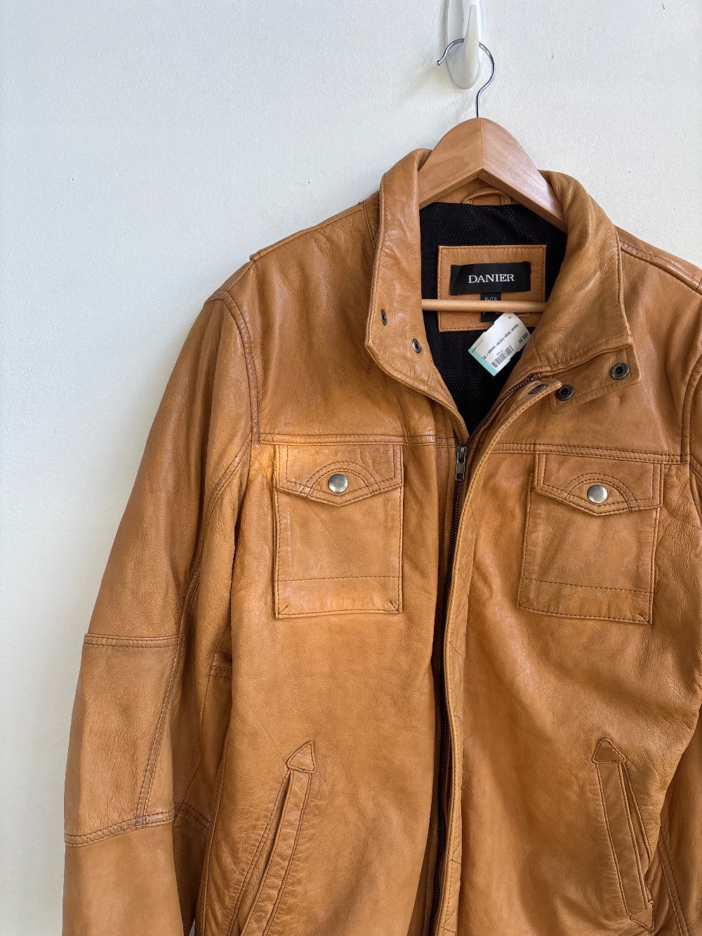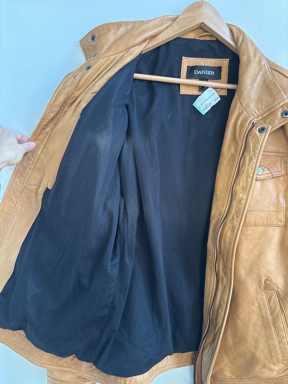 A light beige leather jacket with a black mesh inner for warmth. Features a zip down front, multiple pockets, and a button neck collar.