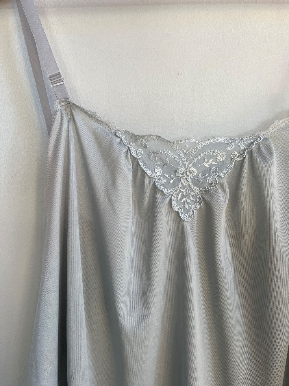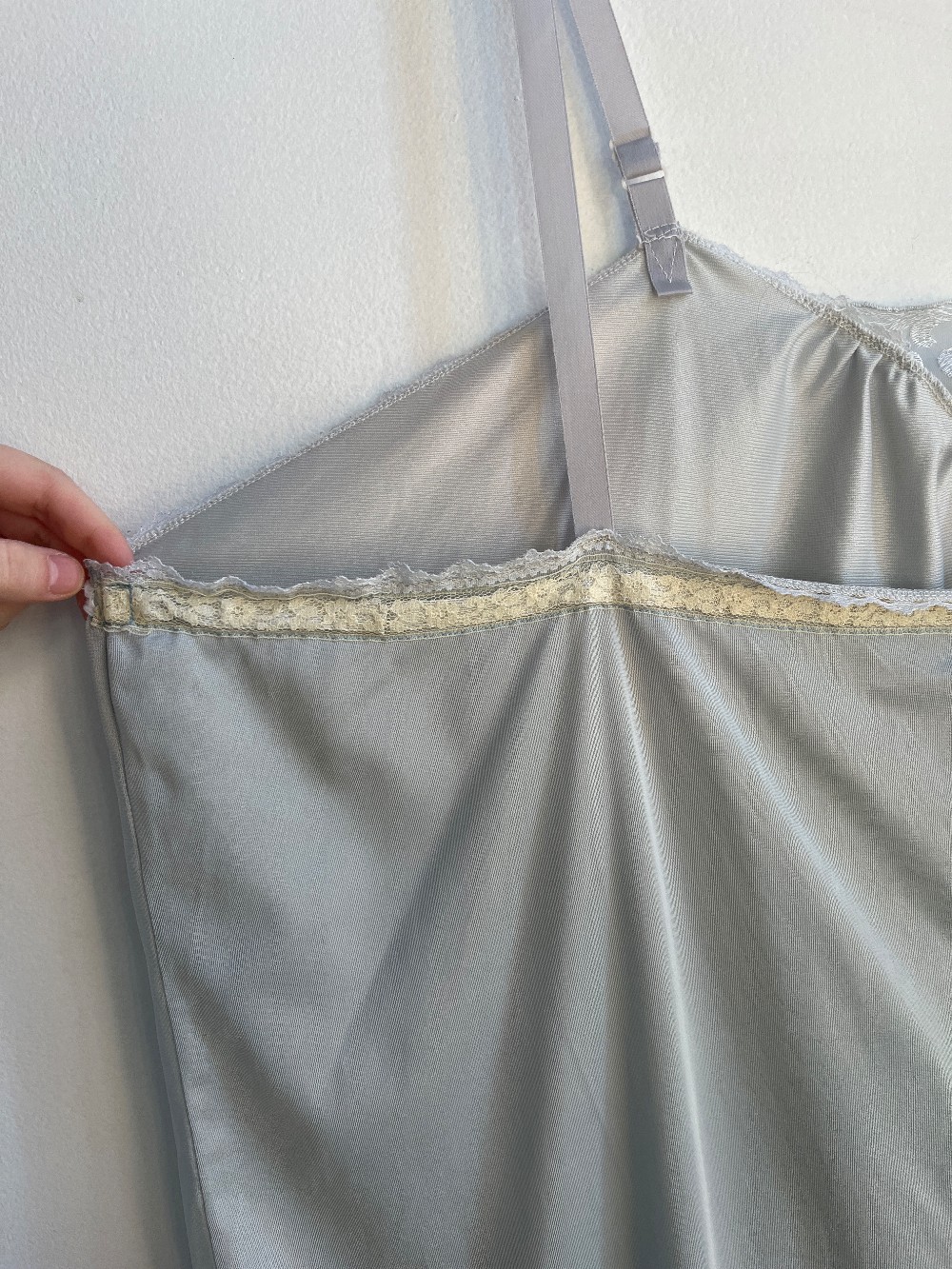 A light baby blue camisole that is breathable and satin. Features a lace neckline and adjustable straps.