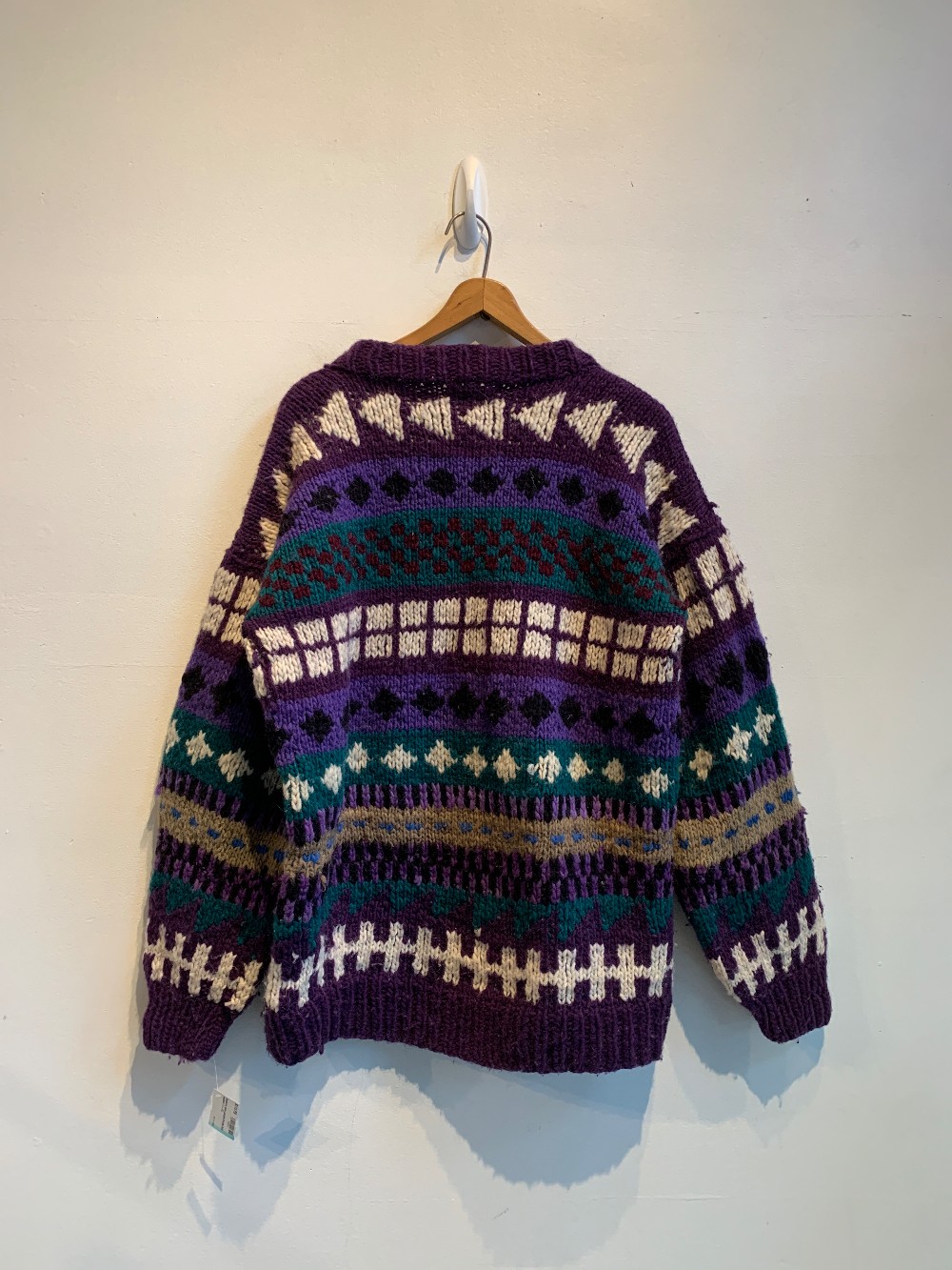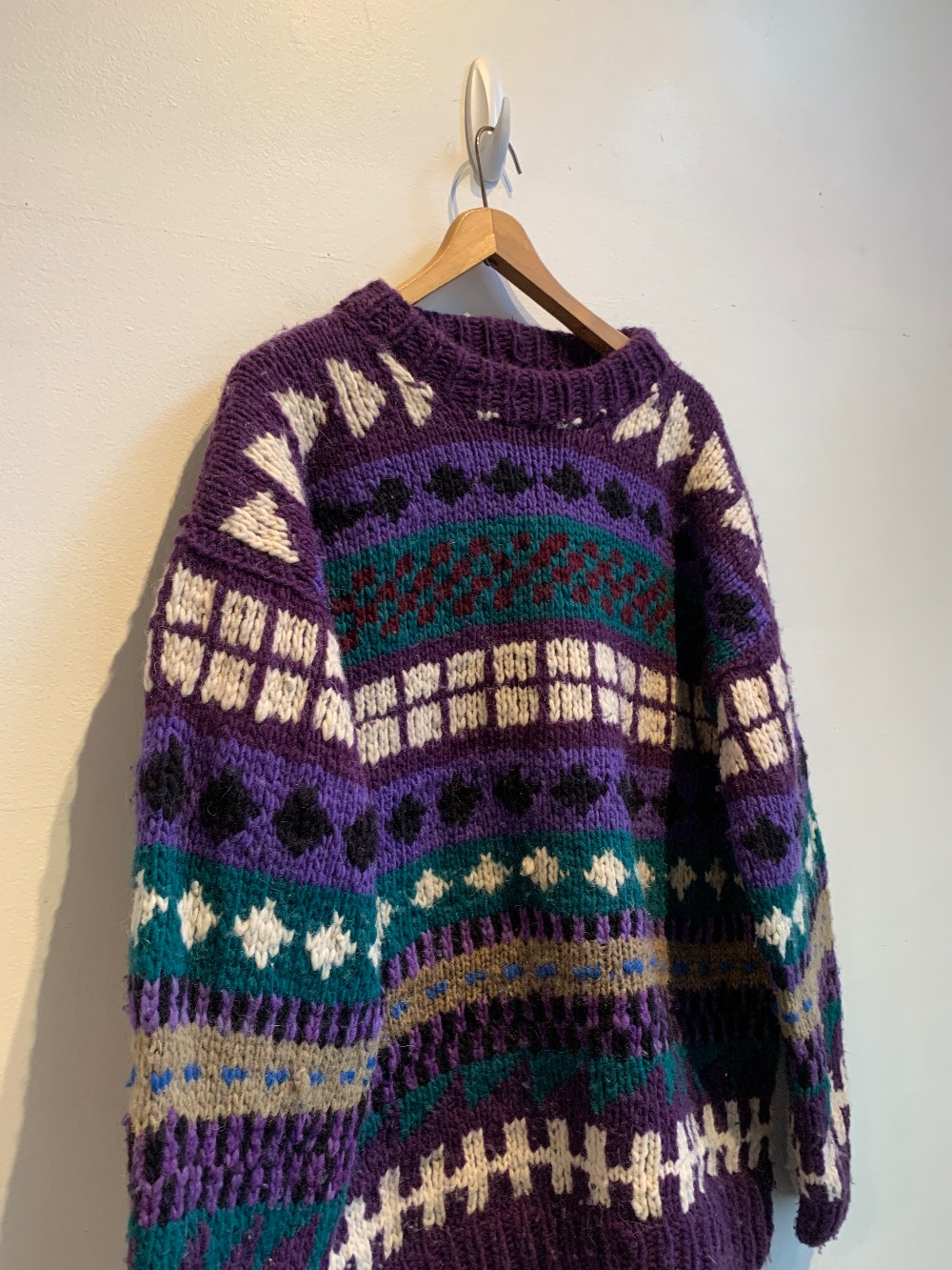A wonderfully warm 100% wool sweater featuring multicoloured purple patterns. Fits with ribbed hems, relaxed sleeves, and a high neck.