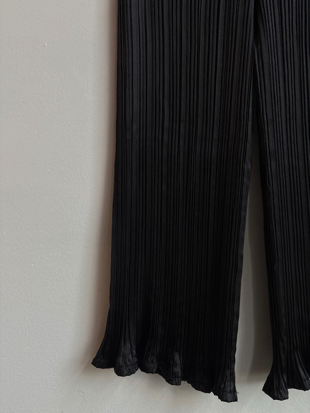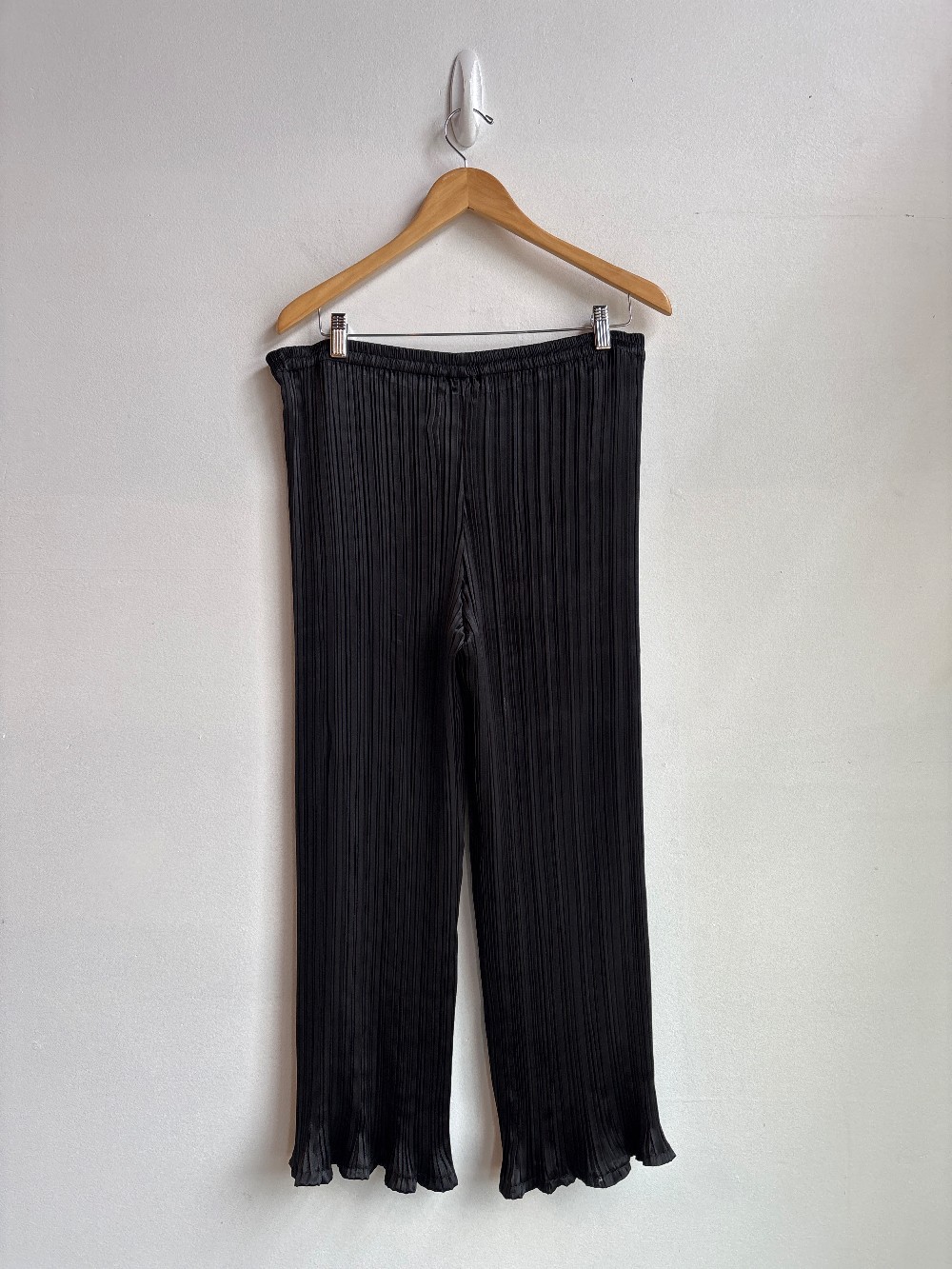 Waist measures 30 inches but stretches quite a bit. ruffle bottom pants with pleated satin fabric and a cropped fit.