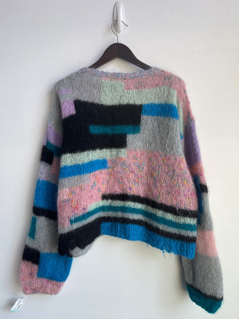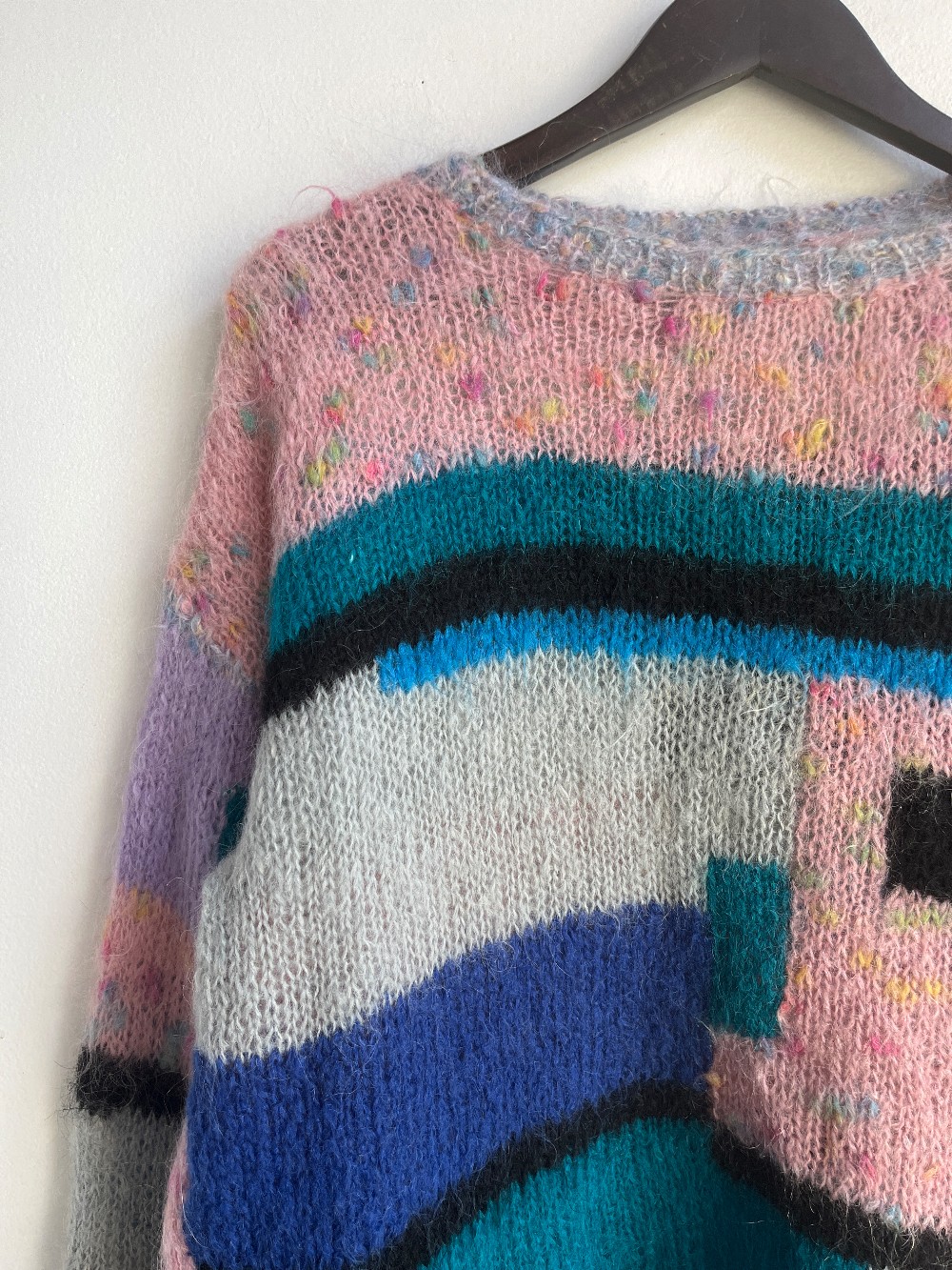 A fun multicoloured geometric pattern sweater made from a soft fluffy mohair. Features a boat neckline.