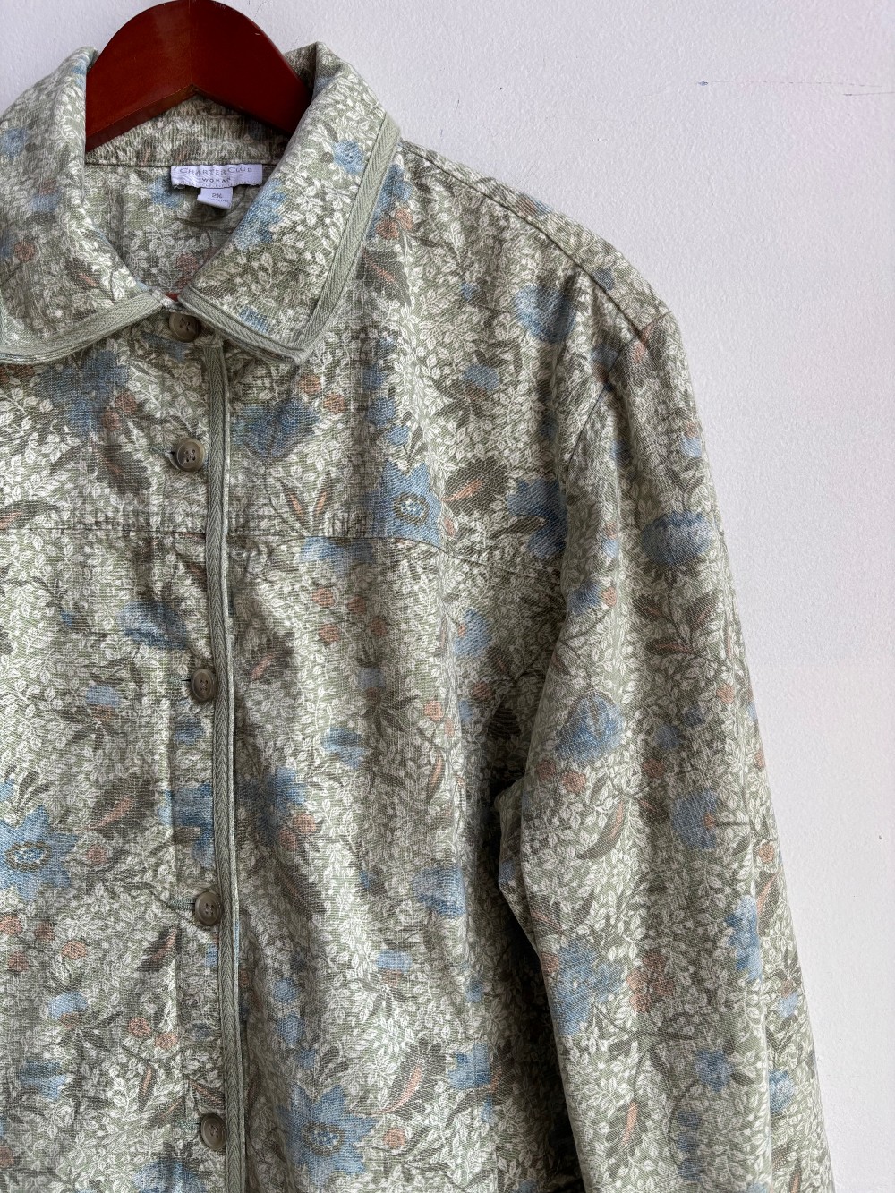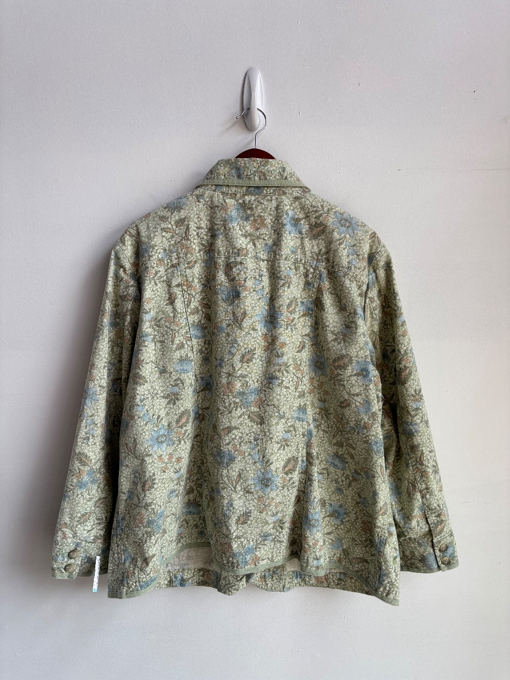 A sage green faded floral pattern with fabric trims and a button up front. Features two button pockets and sleeve cuffs. Made from cotton!