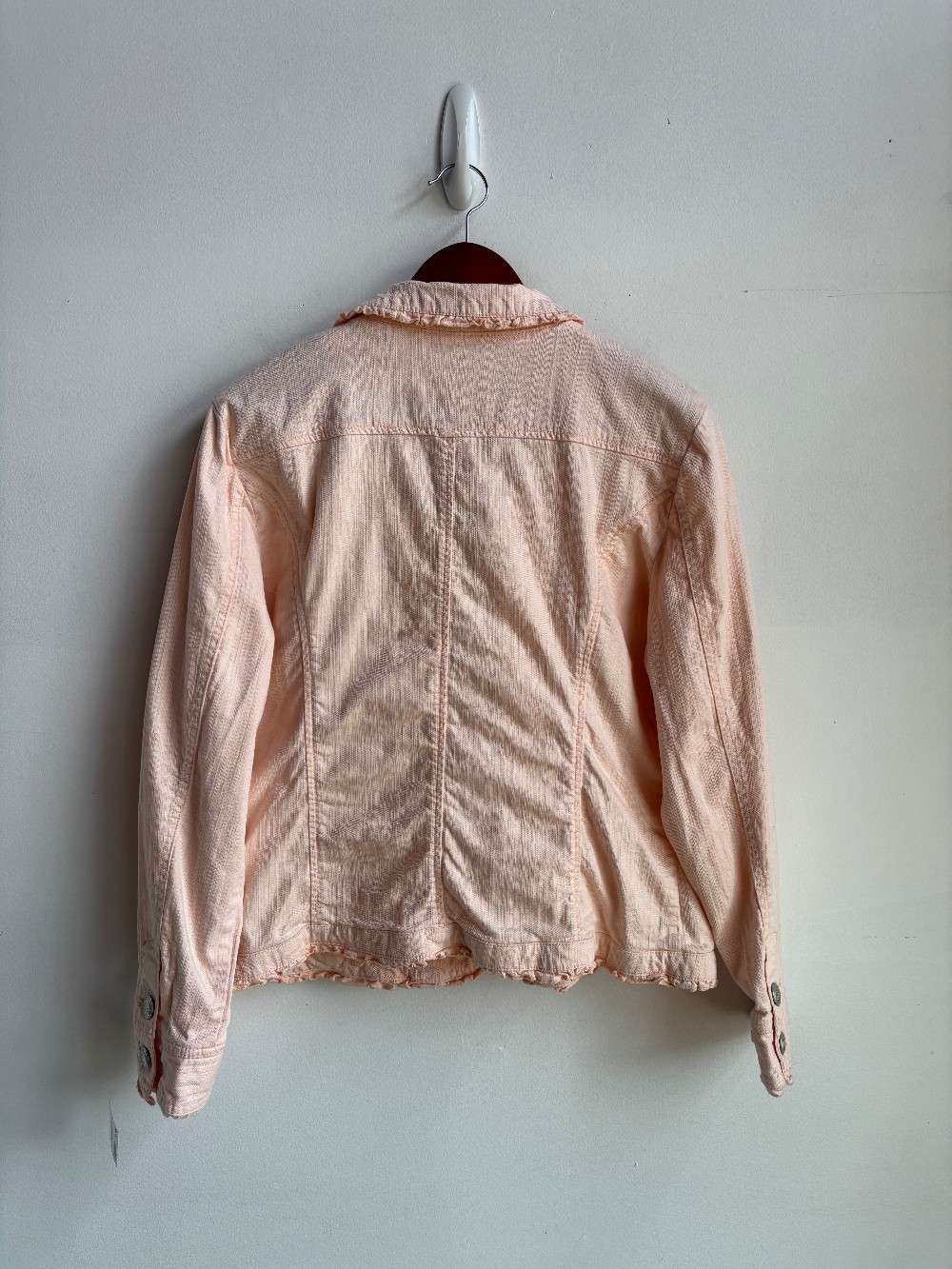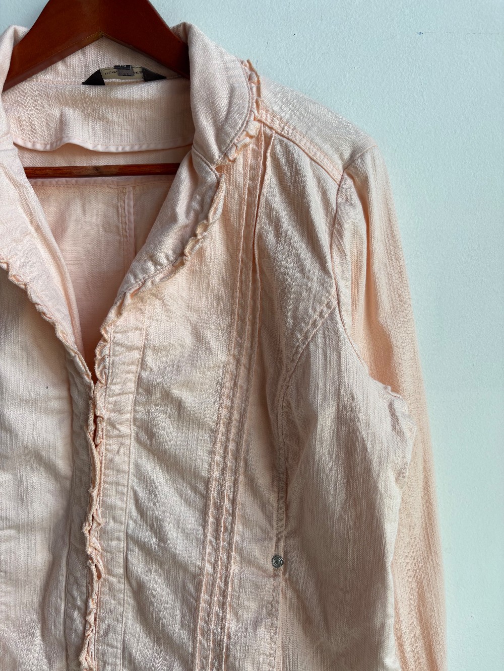 A darling pastel pink jacket with frilly trims, pin tucks, and darts for a boxy fit. Features two pockets and a clip front. Made from cotton!