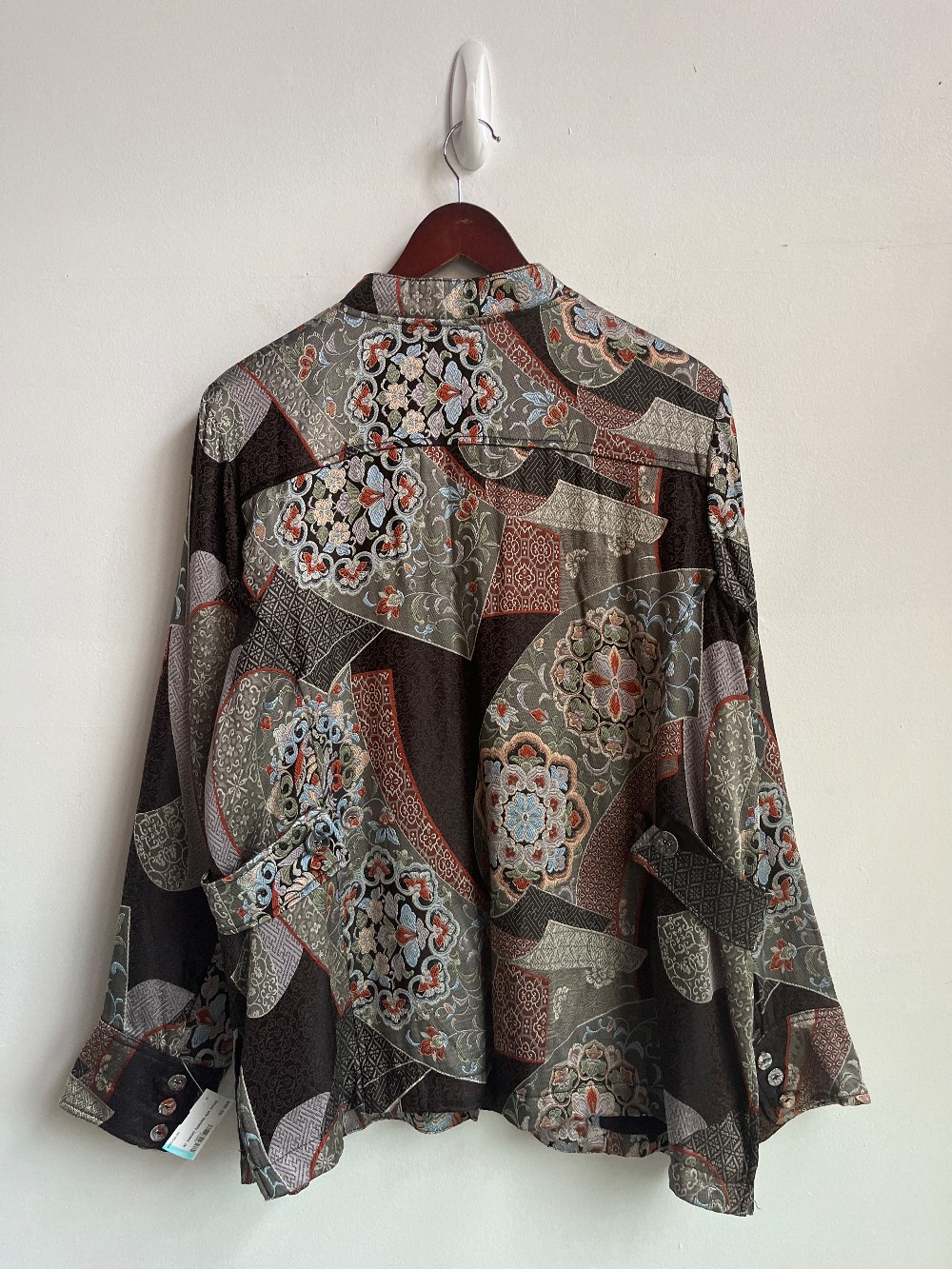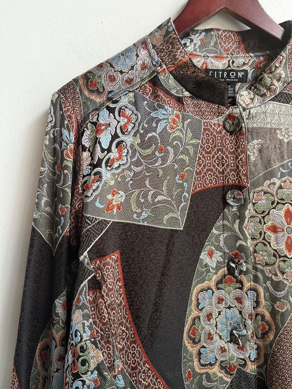 A luxe multi pattern heavy silk jacket with a button up front, high neck, long sleeves, tapered fit and button cinched waist.